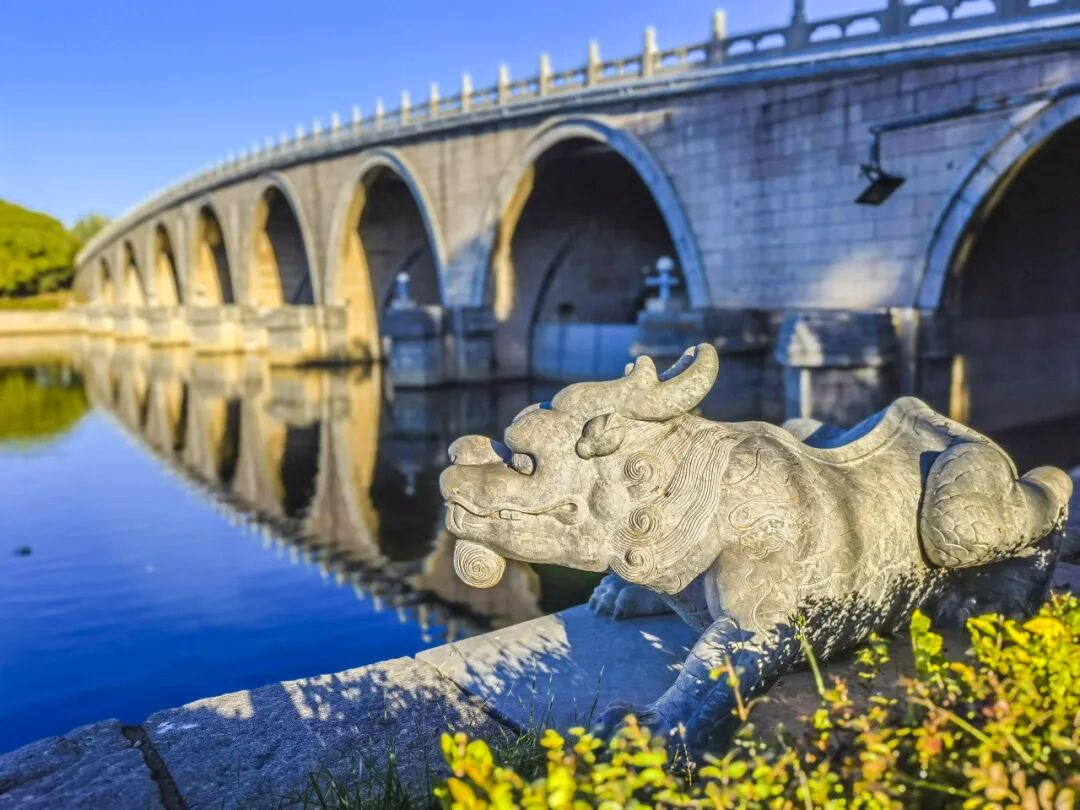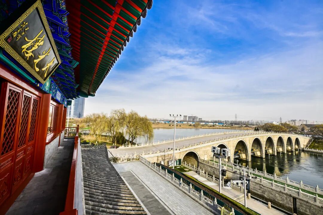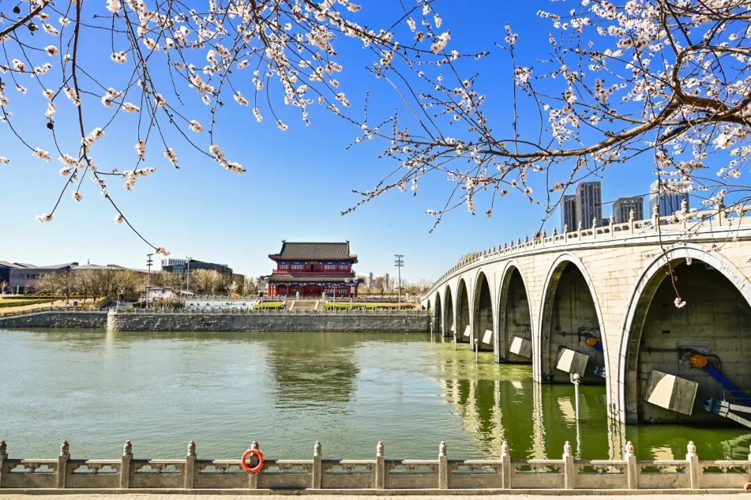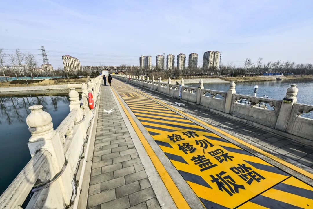 在千荷泻露桥上向北望去,大光楼边上的那座古朴石桥便是北关分洪枢纽的新拦河闸。曲一介绍,新拦河闸采用闸桥合一设计,在设计之初,就充分考虑到与历史文化相结合,借鉴颐和园十七孔桥的设计思路,采用中国拱形多孔桥的造桥艺术修建。闸室共7孔,将闸门隐于桥下椭圆形的桥洞中,远看是桥,近看为闸,避免了以往启闭机式水闸工作桥过高阻挡视线的不足。由于建设在历史上的石坝码头处,所以这个桥又叫“石坝桥”。为减少工程痕迹,控制闸门的液压结构均通过地下廊道进入大光楼。同时,在拦河闸桥西还增设了一个船闸,未来游船可经此通行,直观见证大运河京冀段水道的复苏。