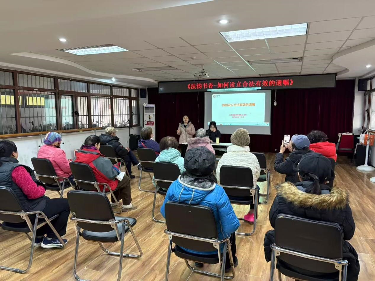 本次活动旨在为社区居民提供权威、易懂的法律知识普及,围绕遗嘱设立这一居民高度关注的话题,系统讲解了遗嘱的法律效力、形式要件、常见误区及注意事项,结合《民法典》相关条文与真实案例,帮助居民理解如何依法、合规、清晰地订立遗嘱。