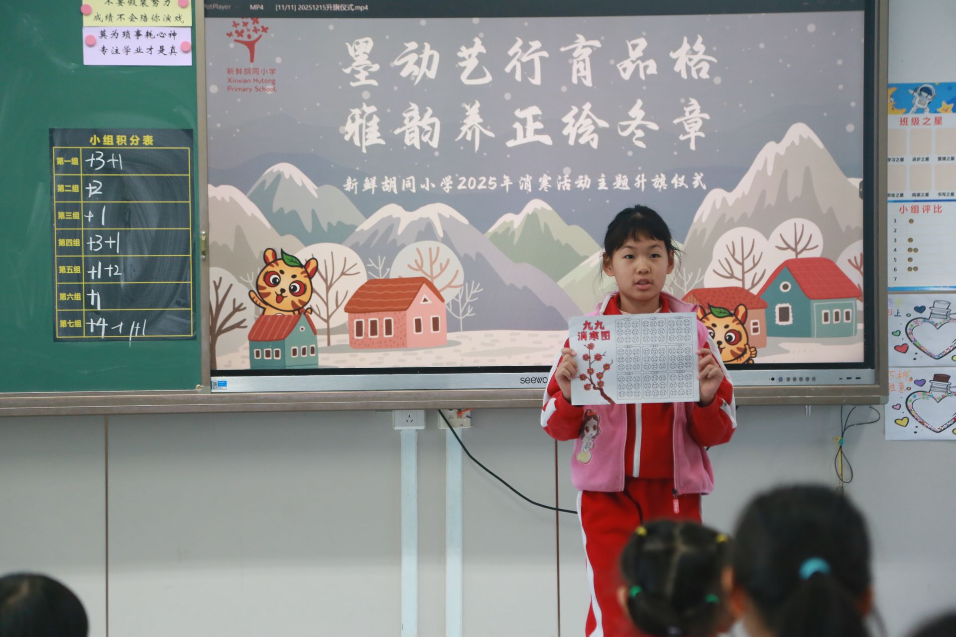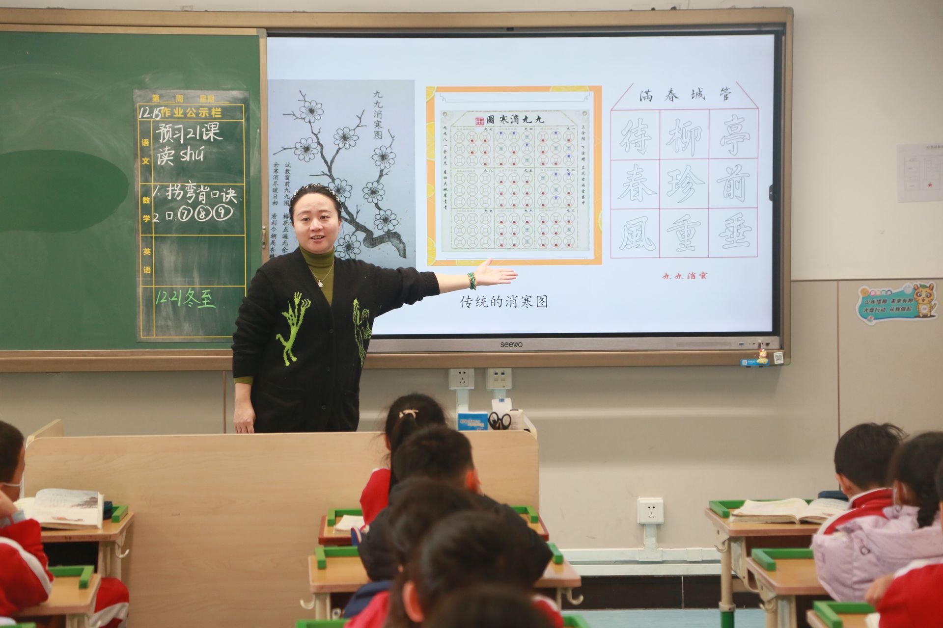 活动伊始,师生共同观看冬至消寒知识视频,冬至由来、“画九”“写九” 传统习俗等内容徐徐展开,让同学们读懂古人“数九盼春”的生活智慧。
