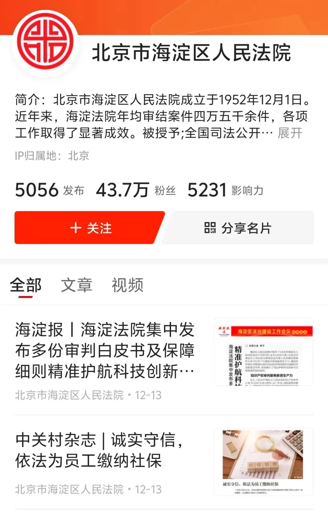 北京海淀法院“人民号”连续两年获此荣誉,自账号开通以来,长期保持高频更新,持续优化发布内容,常态化更新以案释法案例、文章,现有粉丝43.7万,是海淀法院落实“谁执法谁普法”普法责任制的重要平台。