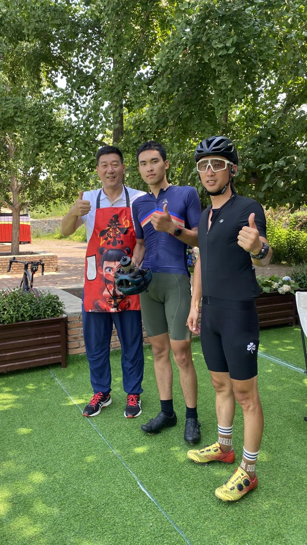 陈勇(左一)在骑行驿站欢迎骑行爱好者