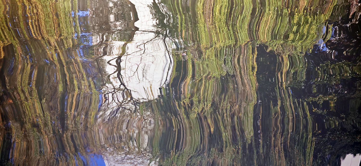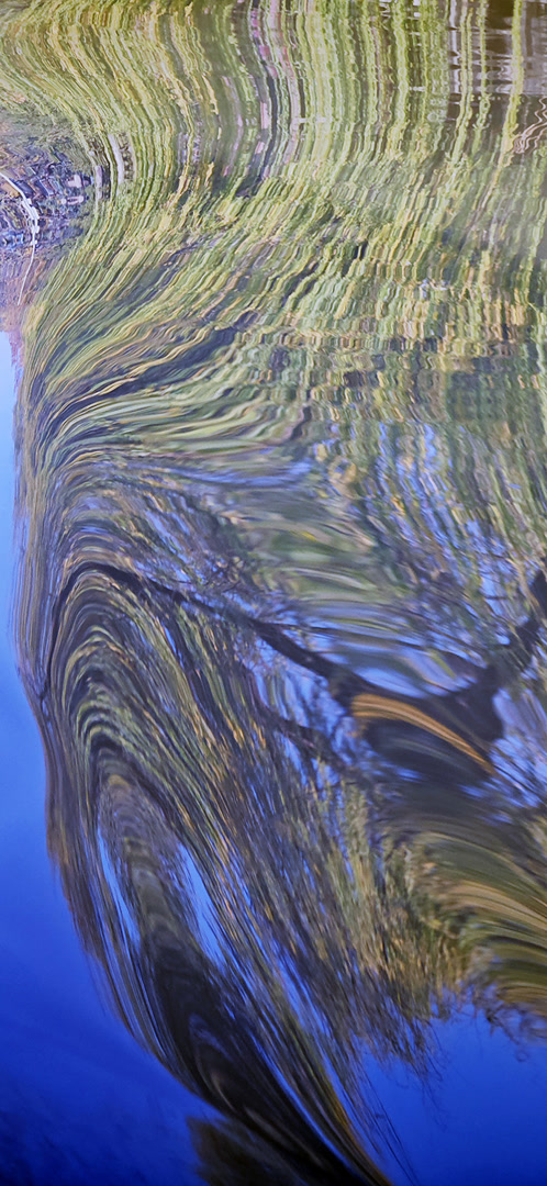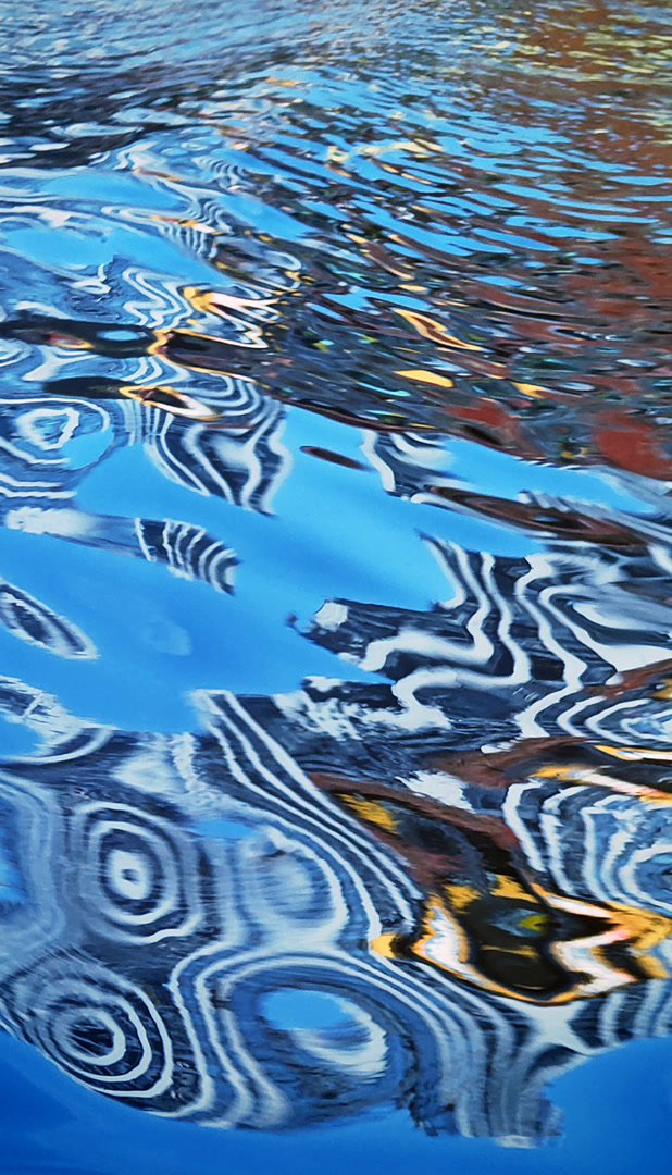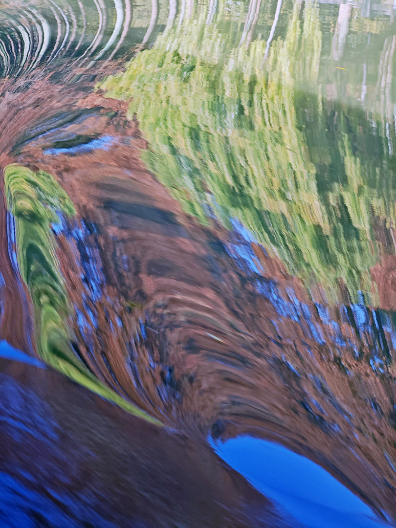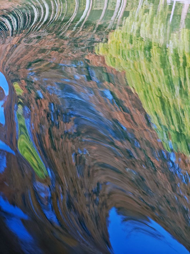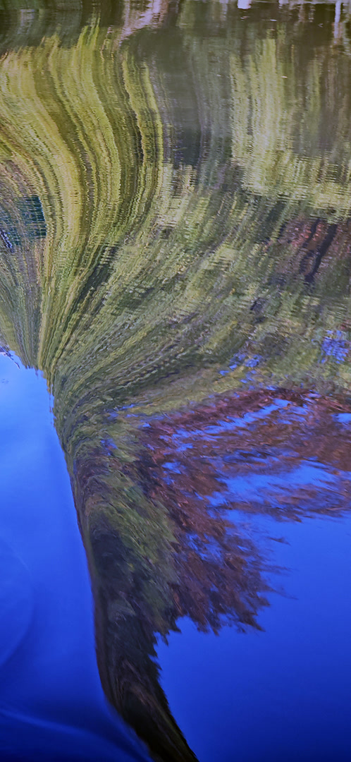 波浪一浪紧接一浪,水面倒影瞬息万变。眼见一片树林的倒影被波浪拉长又压扁,眼见红黄白绿的色彩在水面晕染开来。