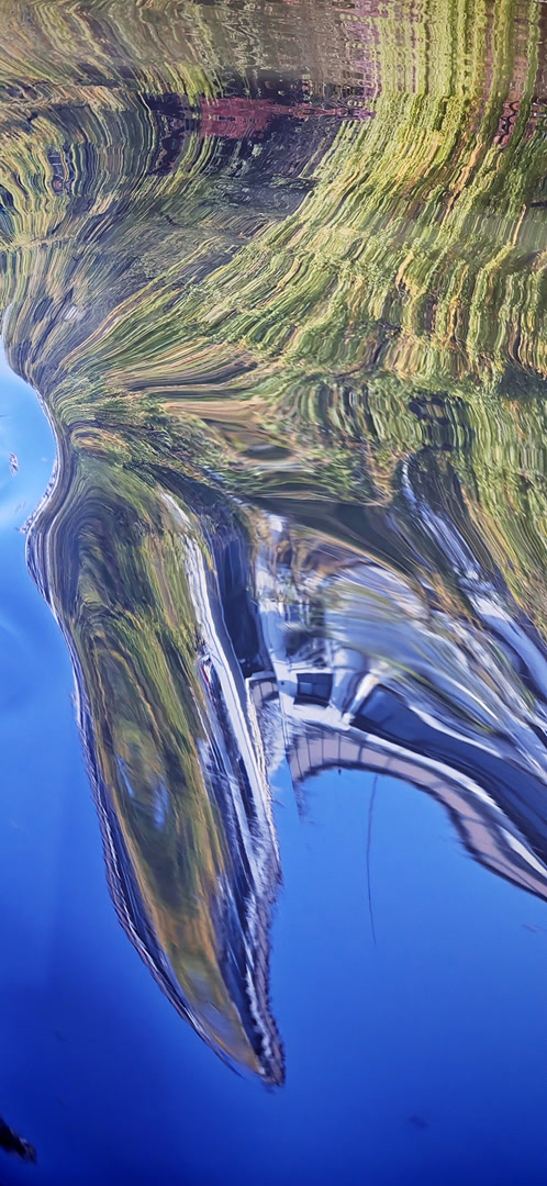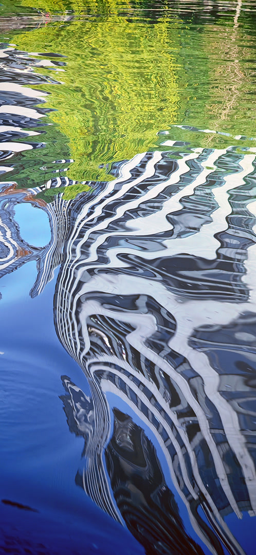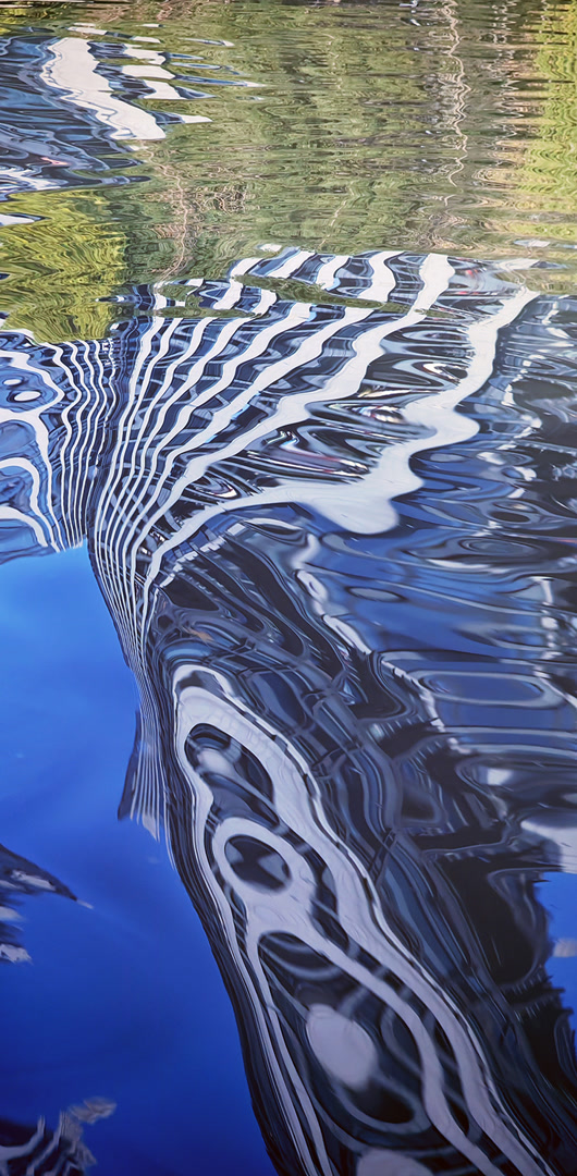 有趣的是,水中的这种破碎不是被彻底毁灭,而是被连续地转化——随着水波起伏荡漾,完整的倒影被分解为点、线、面新的组合,变成了一幅幅“抽象画”。