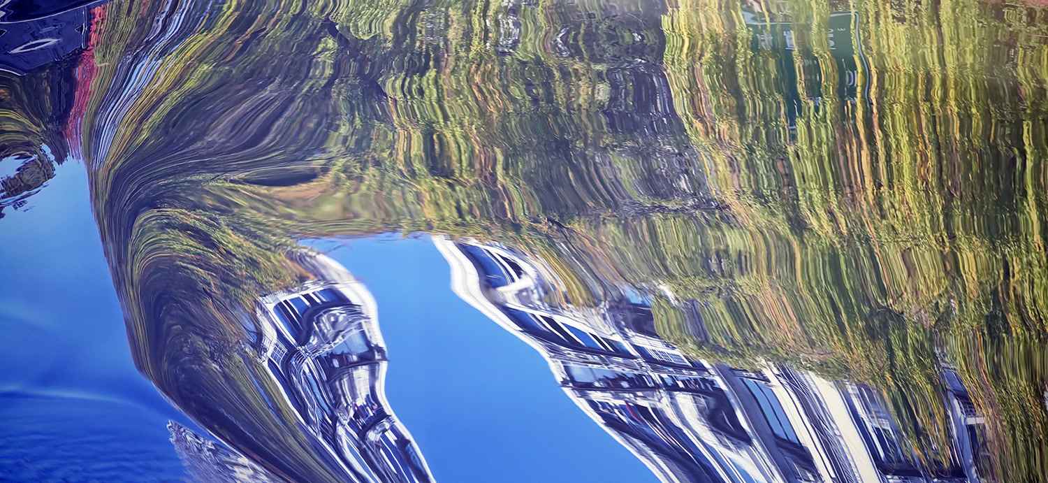 拍摄间隙,抬头看岸上的真实建筑,再回看拍到的照片,深感三个奇妙。一是真实的建筑都是静止的,水中的倒影则都在舞蹈。二是真实的色彩都很稳定,水中倒影色彩都在相互交融。三是真实的房子都是立体的,水中倒影则因波浪产生惊奇的效果。