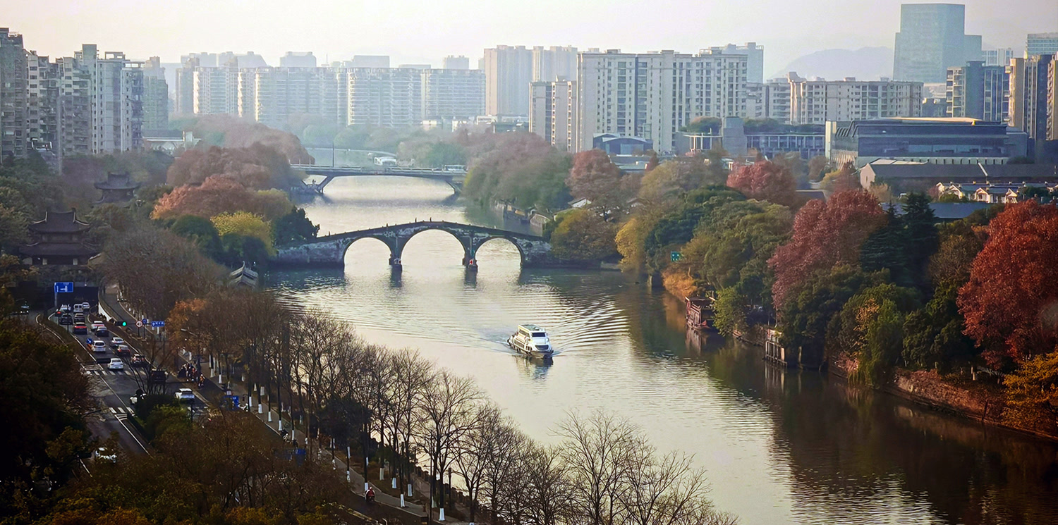 下午,冬日阳光温暖地洒在河面上,正是乘坐游船游览运河的好时光。水上巴士1号线是贯穿杭州市中心的经典河道线路,随着游船启动引擎缓缓离开码头,平静的河面被划开一道V形波纹。