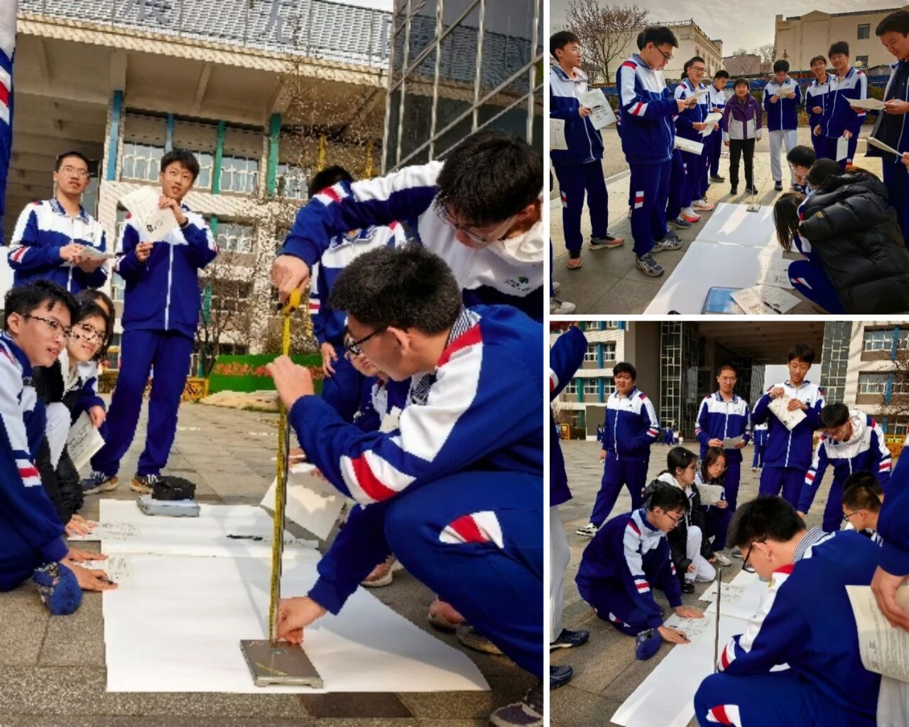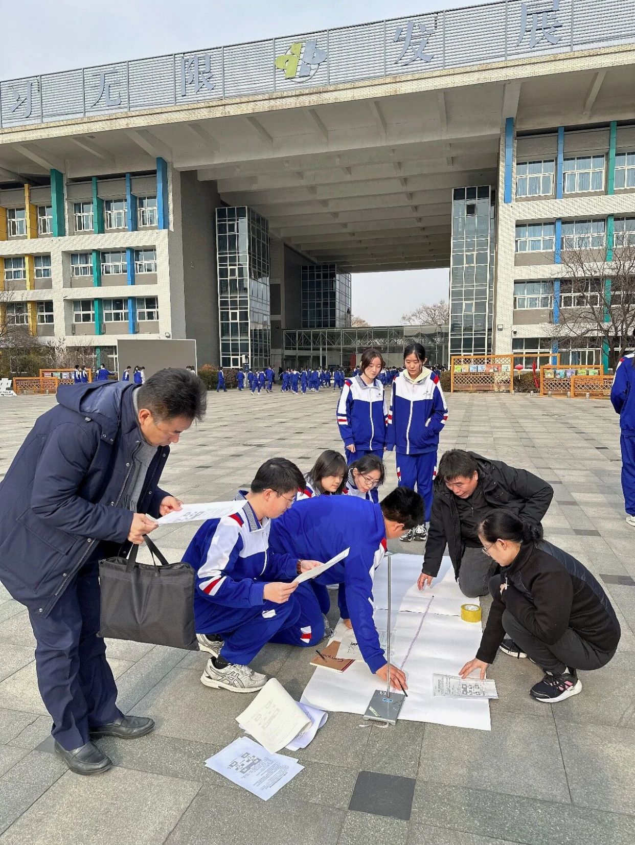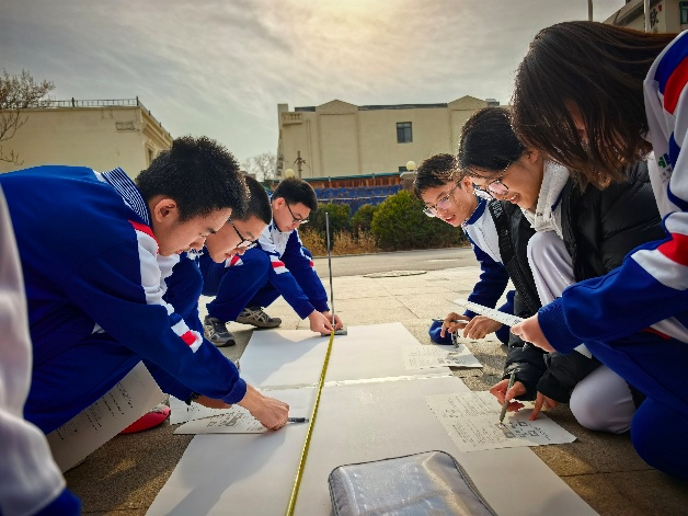我校坐落在中轴线上,其建筑设计也蕴含着与中轴光影相通的地理原理。12月10日临近冬至,是北半球一年中正午太阳高度角最小的时期,也是建筑投下最长影子的时刻。地理组为学生们精心选择这一实践契机,探究正午太阳高度与楼间距关系。学生们带着课堂上学到的地球运动知识,怀着对学校建筑采光设计的好奇,从理论的平面图,走向了实践的校园广场。他们用最基础的方法,验证身边的科学。