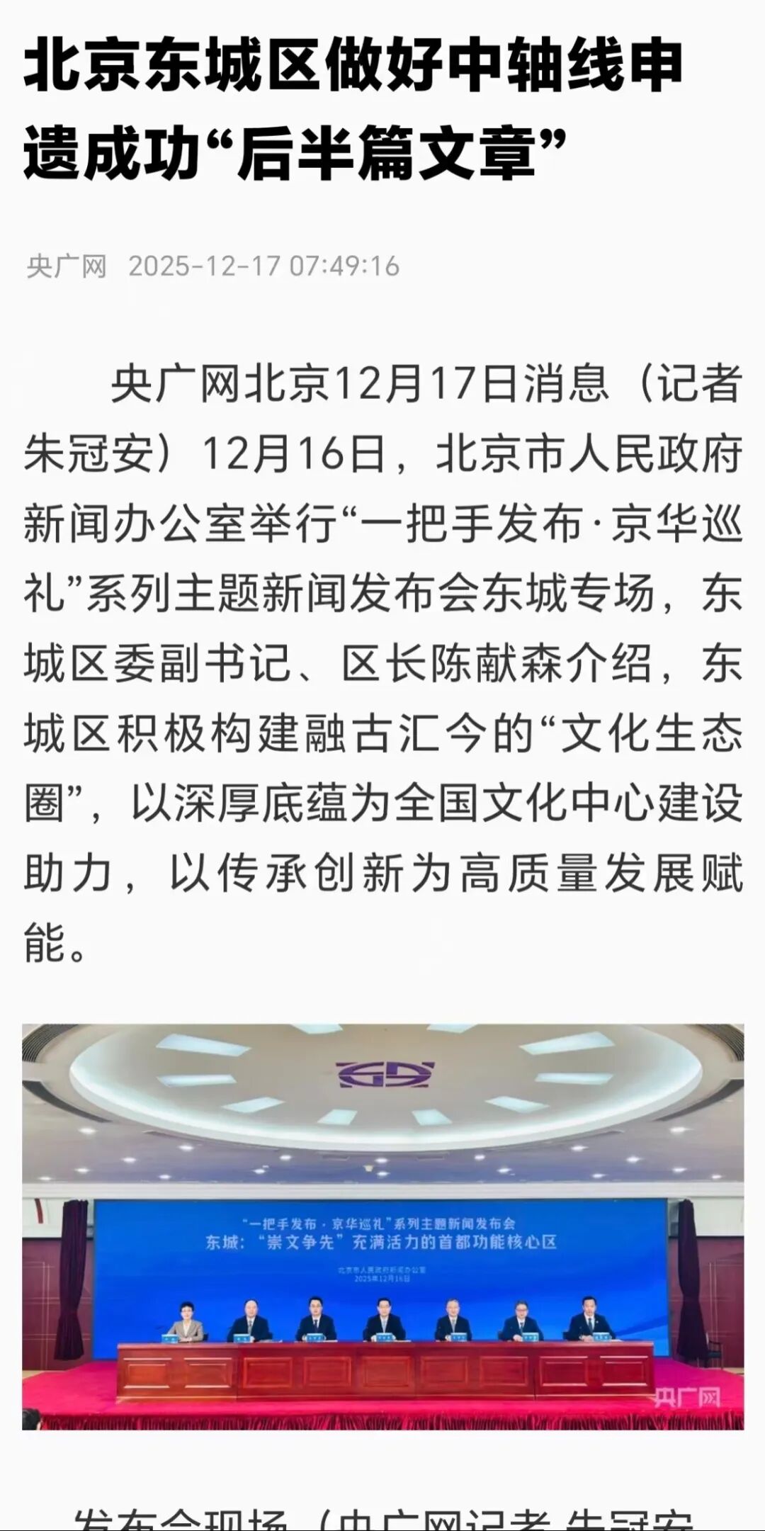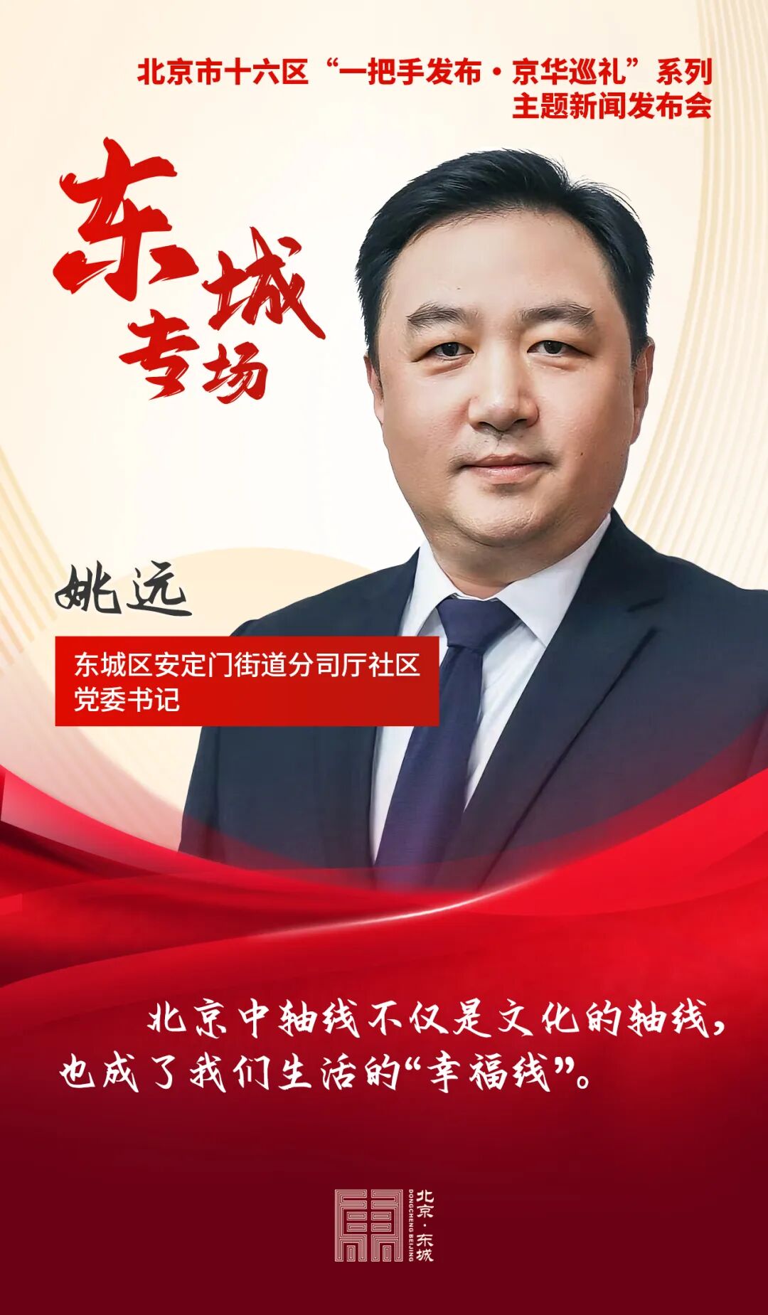 发布会上,姚远围绕“中轴线申遗成功后的生活新变化”,通过三张照片,带领大家领略古都老城新貌,感受老胡同里的现代生活。作为北京中轴线申遗的亲历者、见证者、参与者、受益者,姚远从公共文化空间、养老服务驿站等民生场景切入,用接地气的讲述,生动呈现东城区在老城保护更新、民生福祉升级方面的扎实成效。
