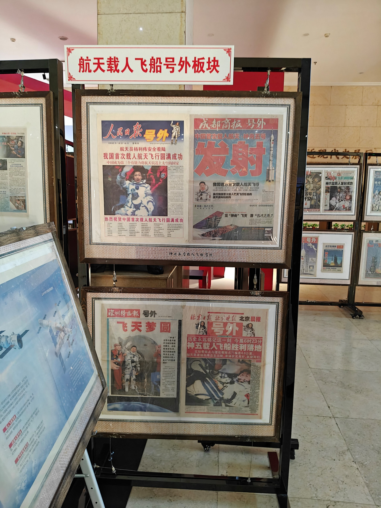 展览中最引人注目的,当属一组珍贵的“连体板块”和“双号外”藏品。其中,科技日报推出的“上天入地”双号外尤为罕见,一份聚焦太空探索,一份关注深海探测,完美诠释了“可上九天揽月,可下五洋捉鳖”的科学豪情,这也是至今我国唯一一次同一天推出两套号外的航天相关报道,具有极高的史料价值。申雨林介绍,这组连体板块由三个部分组成,既有拼接而成的专题合集,也有完整的整体版面,直观展现了神舟系列从无人试验到载人飞行的跨越式发展,其中神舟四号的模拟有人飞行试验、神舟五号杨利伟实现载人航天历史性突破等关键节点的报道,让观众得以重温中国航天的高光时刻。