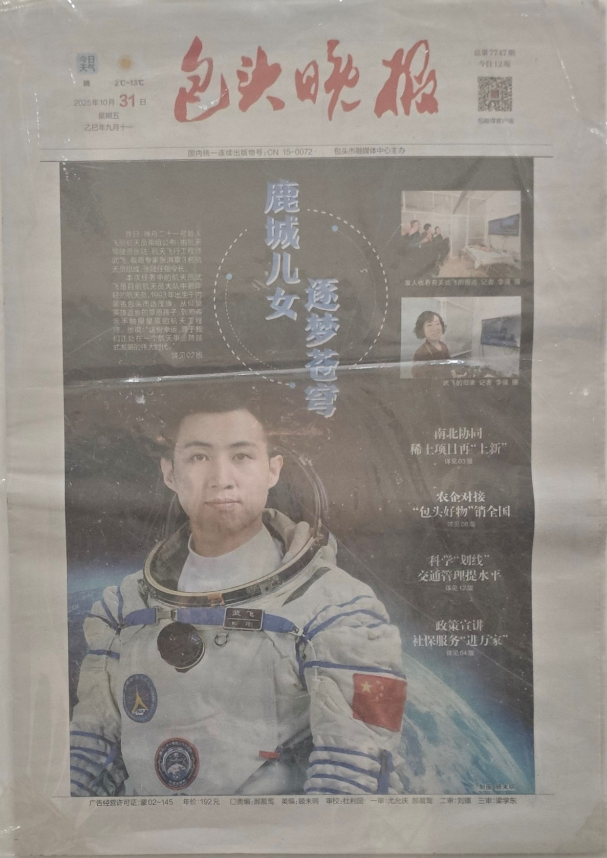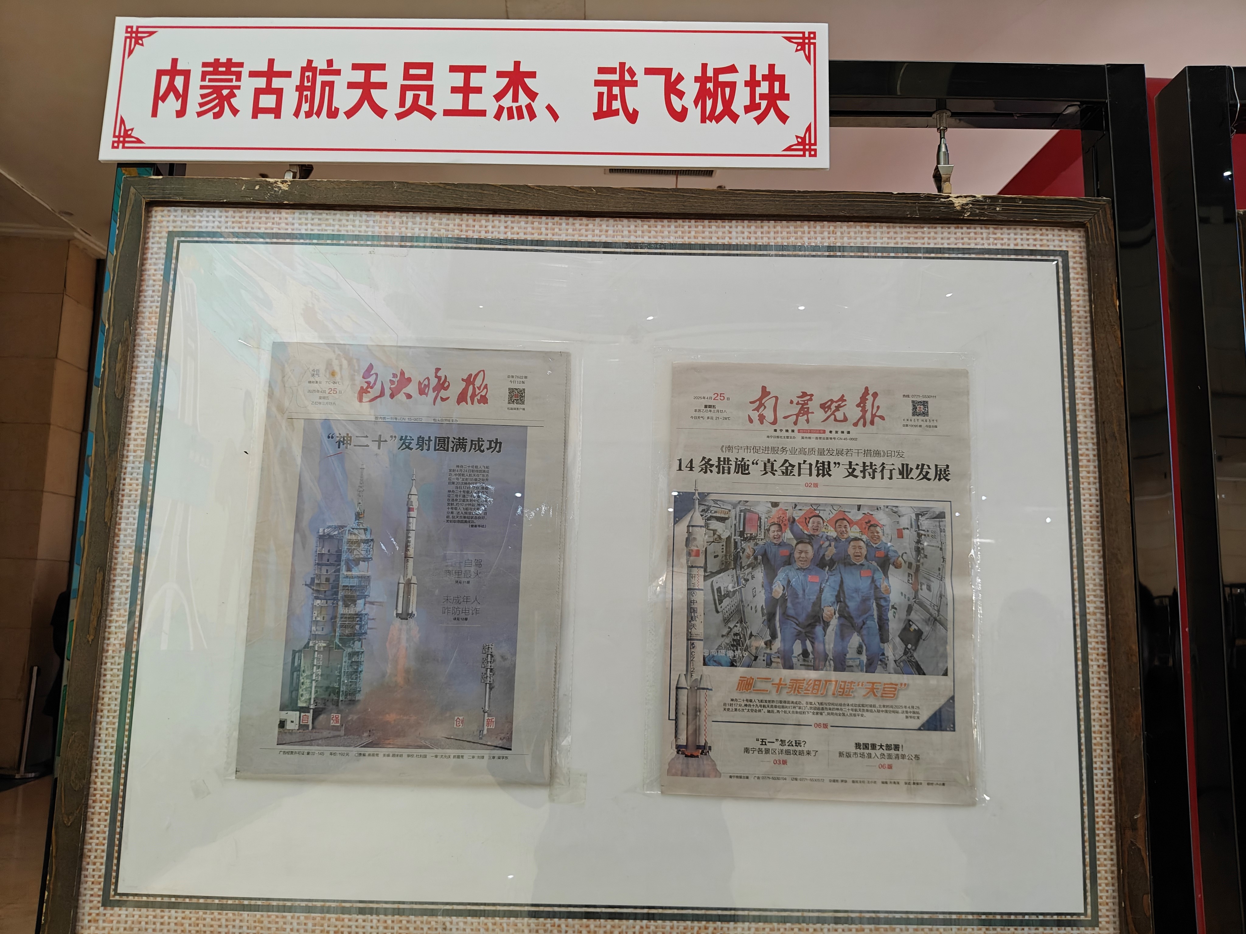 来到内蒙古籍航天员专题展区,申雨林指着展台上的系列报道,逐一为我们介绍:“这位是来自巴彦淖尔市乌拉特前旗的神舟二十号航天员王杰,从阴山脚下的牧羊少年成长为航天工程师,他考入沈阳航空航天大学后,又攻读北京航空航天大学硕博学位,最终入选航天员乘组,非常不容易。”接着,他又指向另一份关于包头籍航天员武飞的报道,感慨道:“以前总有人说包头风沙大,难以出飞行员,这两位航天员的故事,就是对这种说法最好的反驳,地域从来限制不了梦想的绽放。”来自全国各地的报纸对这两位航天员的报道汇聚于此,在申雨林的讲解下,不同编辑风格和报道视角背后的航天精神,更直观地传递到我们心中。