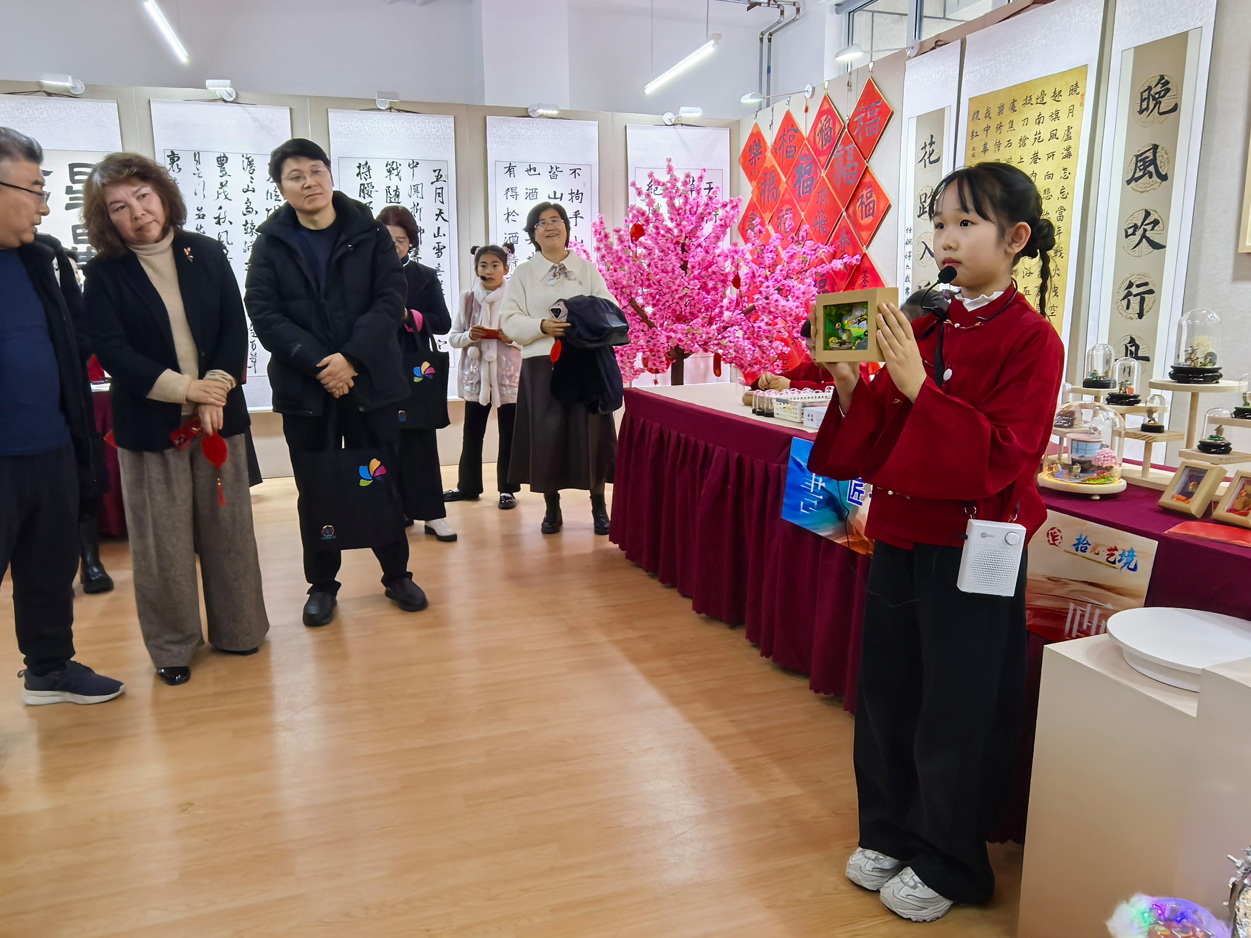 “我用三周时间反复打磨作品的章法布局,我深深感受到写字就像爬山,只要坚持往前走,就能看见别样的风景。”“毛猴是北京特色的非遗传统手工艺品,以蝉蜕、辛夷等天然材料手工制成,小巧玲珑、憨态可掬。”“皮影艺术已有一千多年的历史,不仅是民间艺术与戏剧巧妙结合而成的艺术品种,而且是我们少年儿童喜爱的娱乐活动。”……备受关注的是,除了静态作品的展示,金帆书画院社团的同学们还化身热情的“小讲师”,不仅为前来参观的观众详细介绍作品的创作理念与背后故事,还带领观众体验国画创作、书法临摹、毛猴制作、虚拟摄影体验等艺术实践活动,在亲手操作的过程中,大家尽情感受艺术的乐趣,让美育从“被动欣赏”悄然转变为“主动参与”的温暖互动。