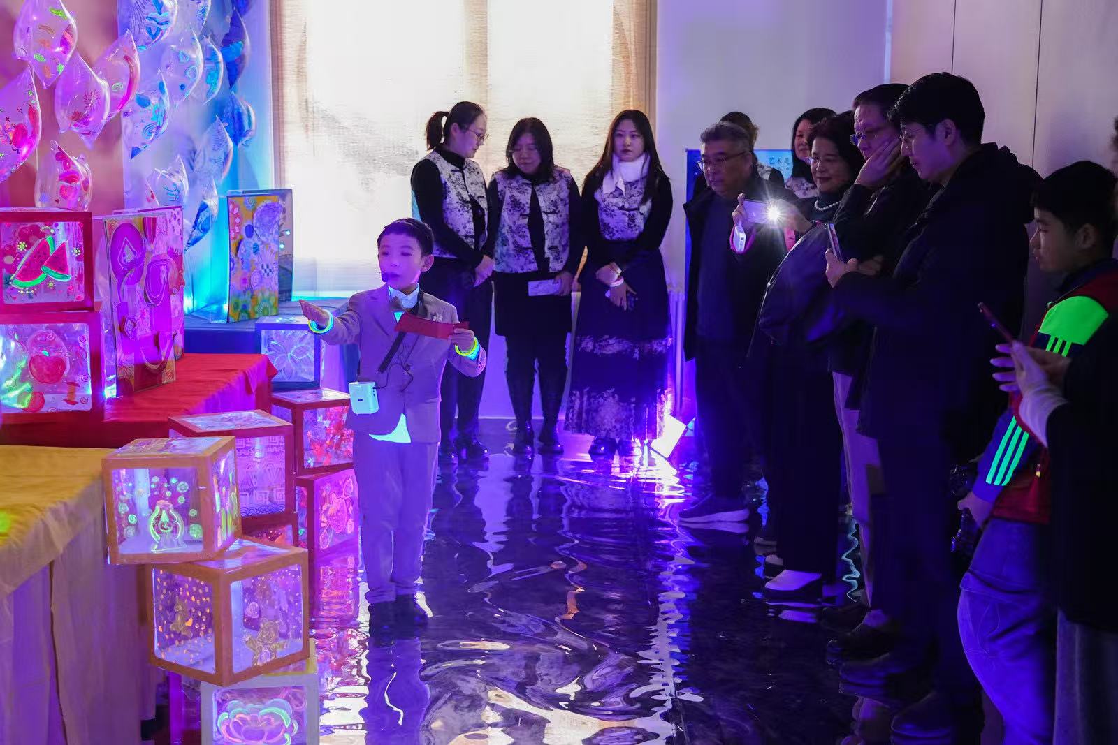 展览设置传统文化展厅与现代创意展厅两大核心区域,打造出沉浸式艺术体验空间。在传统文化展厅内,兰墨书法工作坊前,巨幅书法条幅高悬,笔墨苍劲有力;排列四周的匠·新毛猴工作坊、一剪钟情、水墨丹青工作坊等展台前,国画、毛猴、剪纸等作品满含浓郁文化气息,观众游走其间,仿佛穿越古今文化集市,沉浸式感受中华优秀传统文化的温润魅力。现代创意展厅内形式丰富多元,其中封闭空间在多彩灯光的渲染下,映衬着绘制在气球上的五彩图案,脚下的镜面通道营造出神秘的科幻氛围,宛如走进梦幻的装置艺术世界。