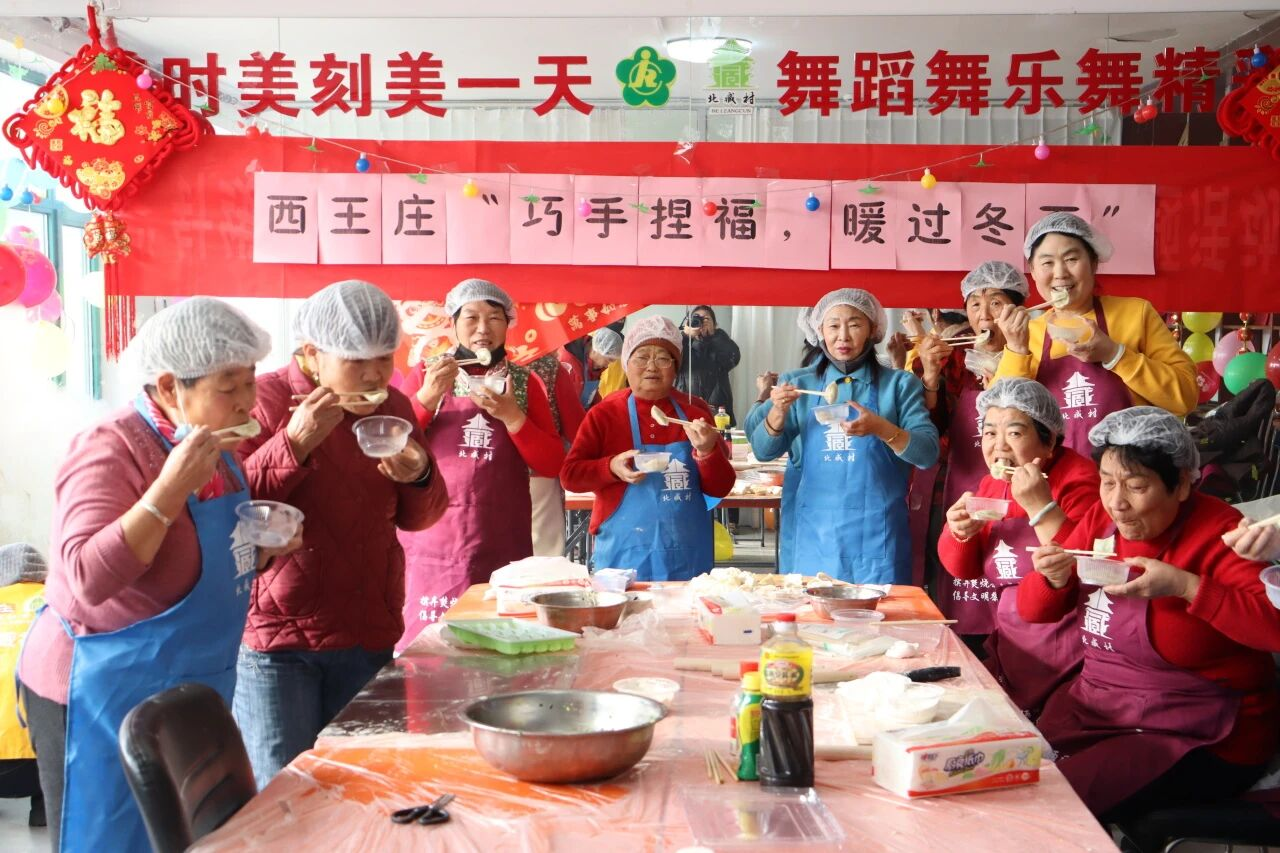 西王庄社工站以饺子为媒,开展“巧手捏福,暖过冬至”活动。村民自发组队分工,调馅、擀皮、包捏有条不紊,形态各异的饺子摆满桌面。下锅后热气蒸腾,大家围坐共品美食,家常闲谈间,食物暖意与邻里情谊交织,让村庄满溢烟火气与人情味。