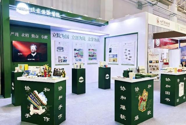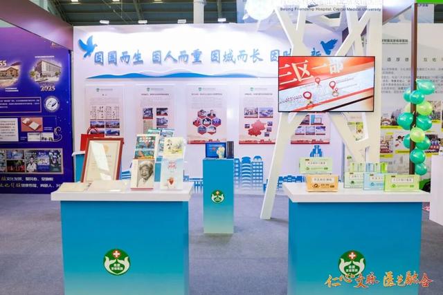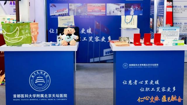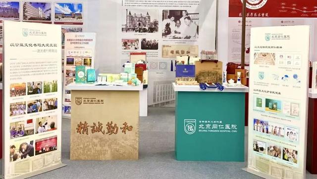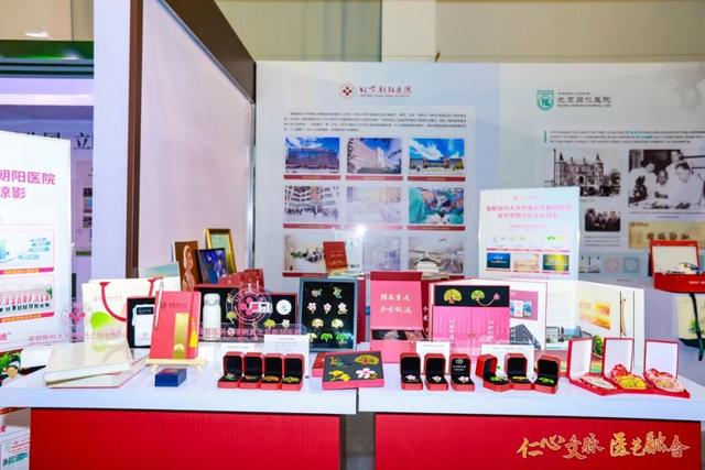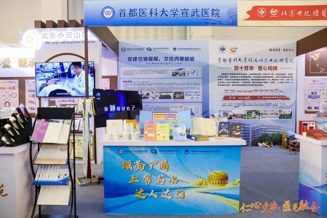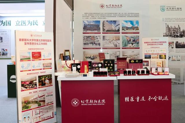 北京朝阳医院以院训精神为核心设四大板块展位。展示了院报、院史馆等文化品牌,以及“凤鸣朝阳”“朝阳之花” 护士节徽章、“生命之树”“生命之舟” 医师节徽章。