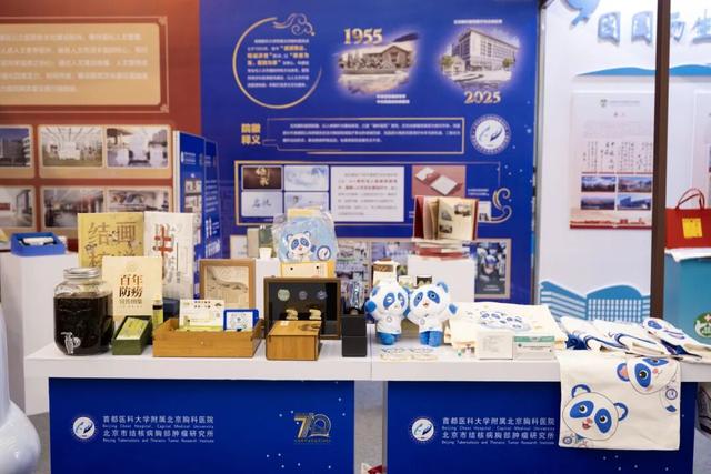 北京胸科医院展台以蓝色系为主色调,突出展示医院IP熊熊可可、建院70年文创、转化成果以及医院文化等相关内容。