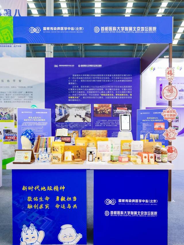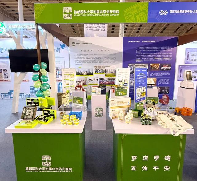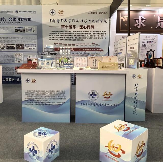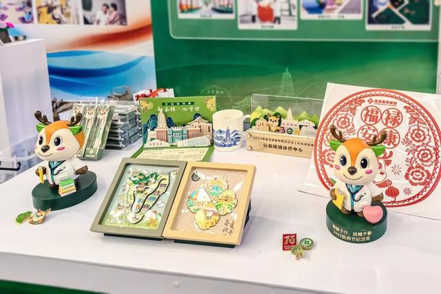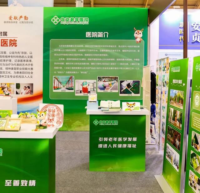 北京老年医院展位通过理念文化体系与系列文创产品的融合展示,呈现医院光辉发展历程与老年友善医院建设成果。