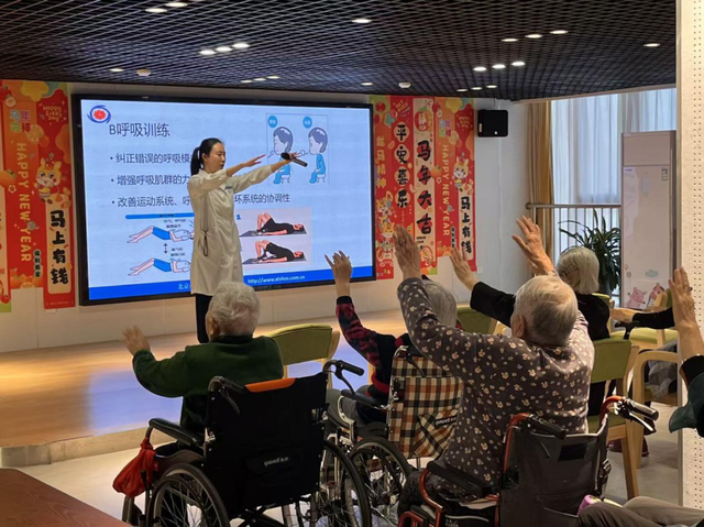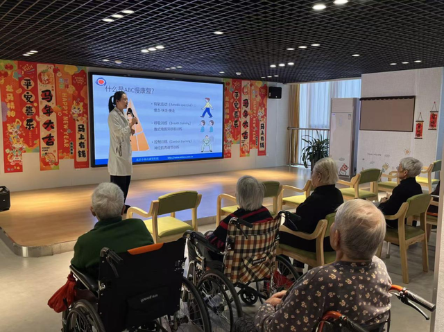 在呼吸训练环节,讲解了腹式呼吸、缩唇呼吸等有助于提升肺功能、改善气体交换效率、并能在一定程度上缓解焦虑的简易方法。老人们跟随指导,积极体验了如何通过调整呼吸节奏来放松身心。