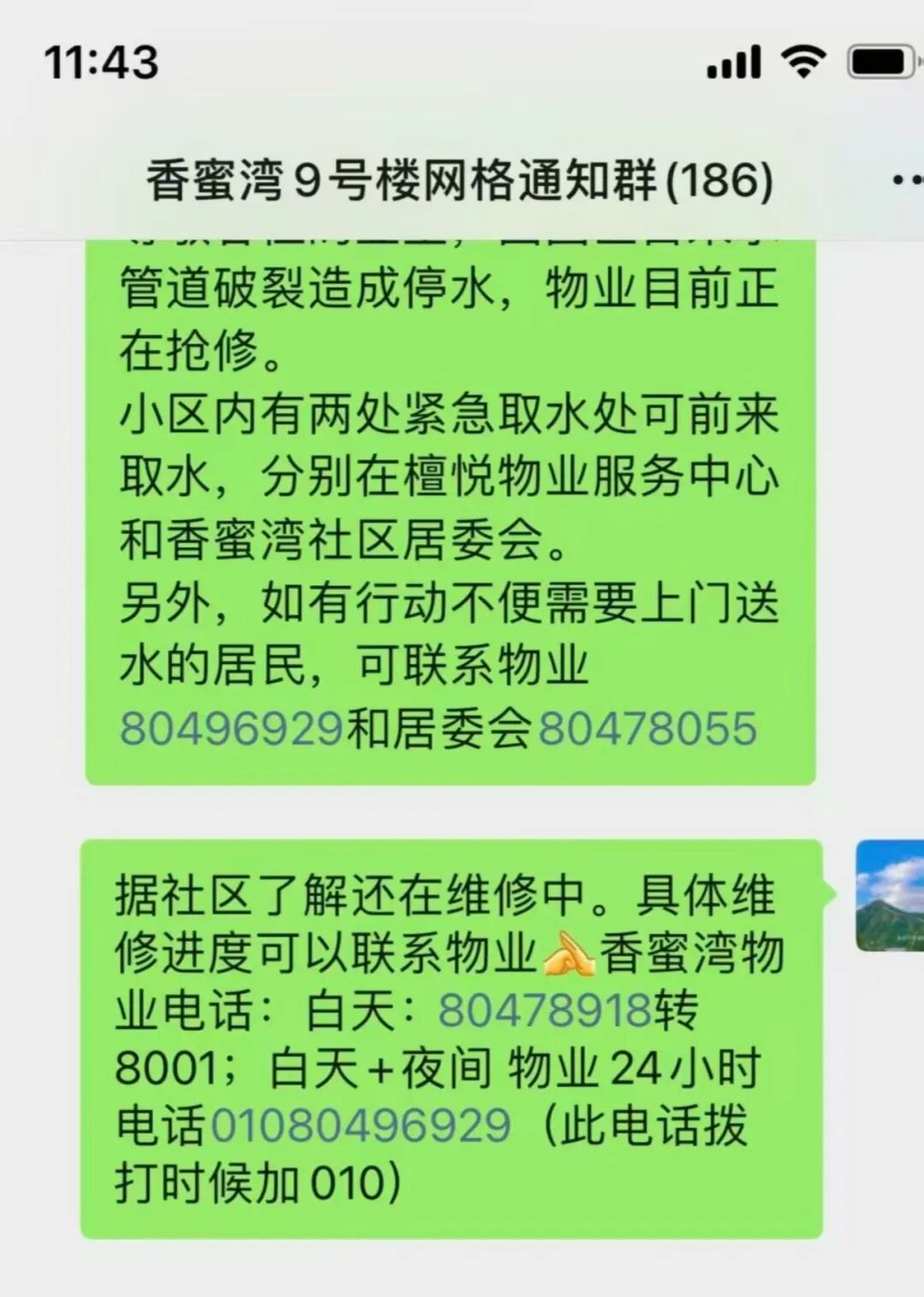 网格员第一时间现场查看情况随后,社区立即在各网格居民微信群发布紧急通知,明确告知停水原因、抢修进展及应急措施,并滚动式播报最新情况。