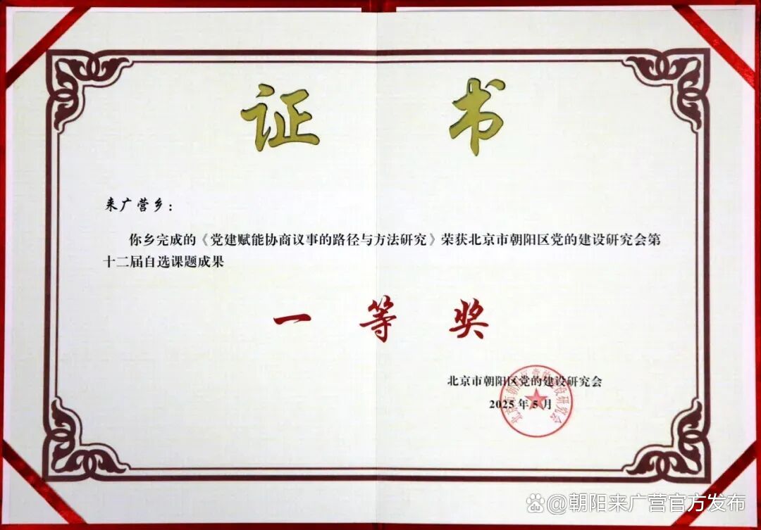 今年,《北京支部生活》第四期刊登《“和得来”议事会:议出家门口的幸福与美好》;《党建赋能协商议事的路径与方法研究》荣获北京市朝阳区党的建设研究会第十二届自选课题成果一等奖;来广营地区“共朝美好 营造为来”党建品牌荣获朝阳区党建引领基层治理创新品牌培树典型;《来广营地区以“和得来”议事会凝聚基层治理合力》入选朝阳区2024年征集活动典型案例并编入《“共朝美好”启新程——朝阳区党建引领基层治理案例集》。
