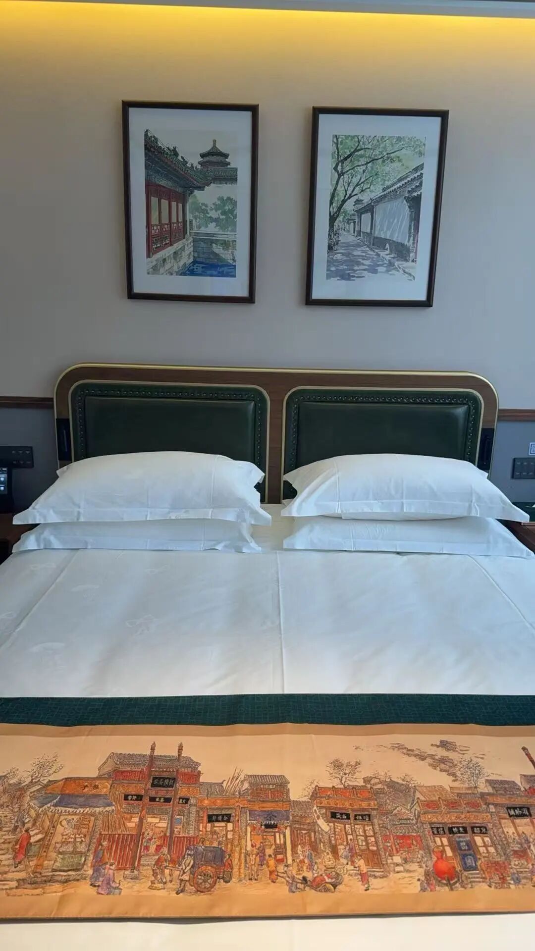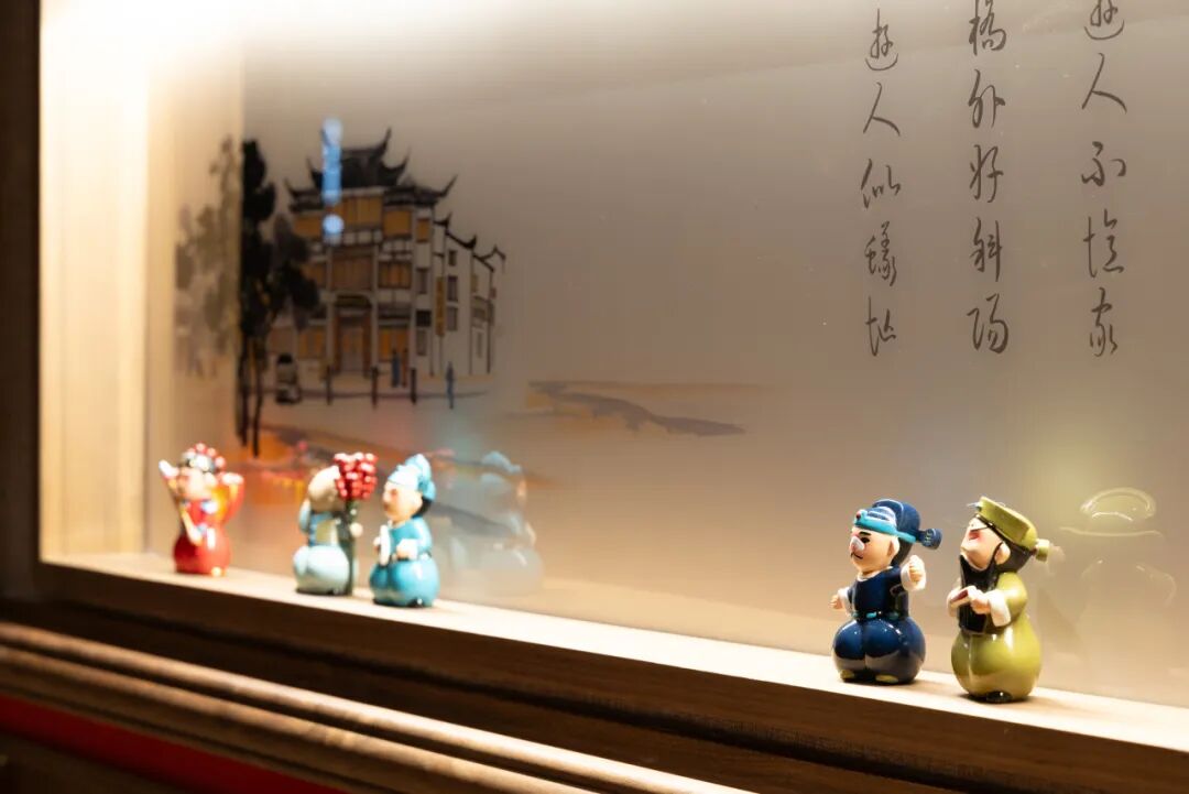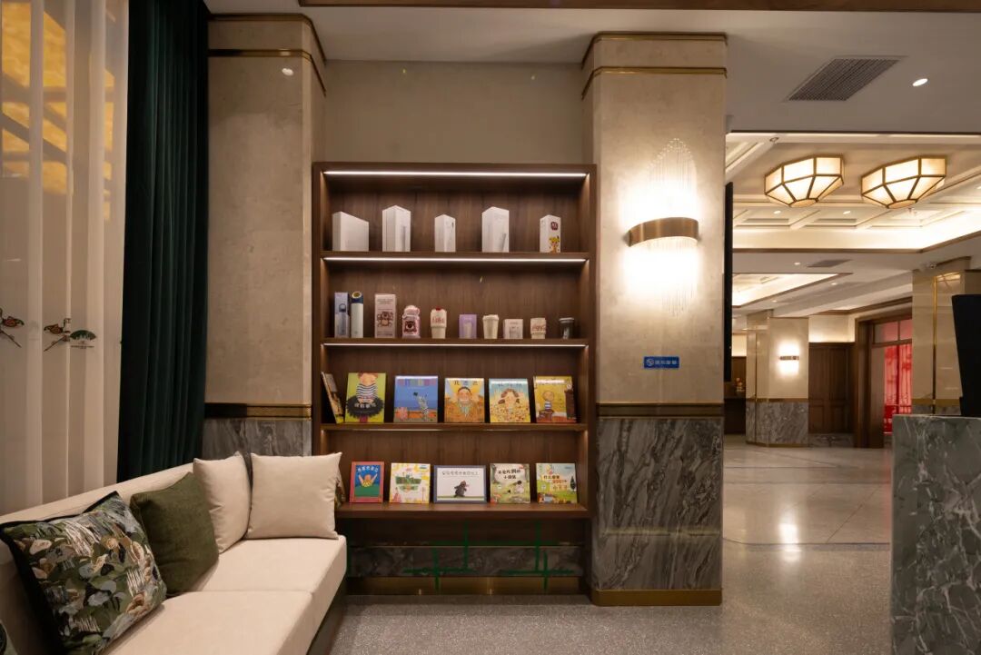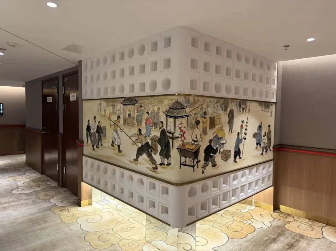 客房内,手绘背景墙描绘着老北京胡同里的四季风情,沙燕风筝图案化作窗纱,在光影间投下灵动剪影;窗帘、床品乃至洗漱用品包装上,均可见非遗元素的现代转译。尤为引人注目的是,酒店选取杂技艺人、说书先生等代表性角色,通过卡通插画形式进行二次创作,既保留了传统文化神韵,又贴近年轻一代审美,真正实现“厚重不失亲切,传统不乏趣味”。