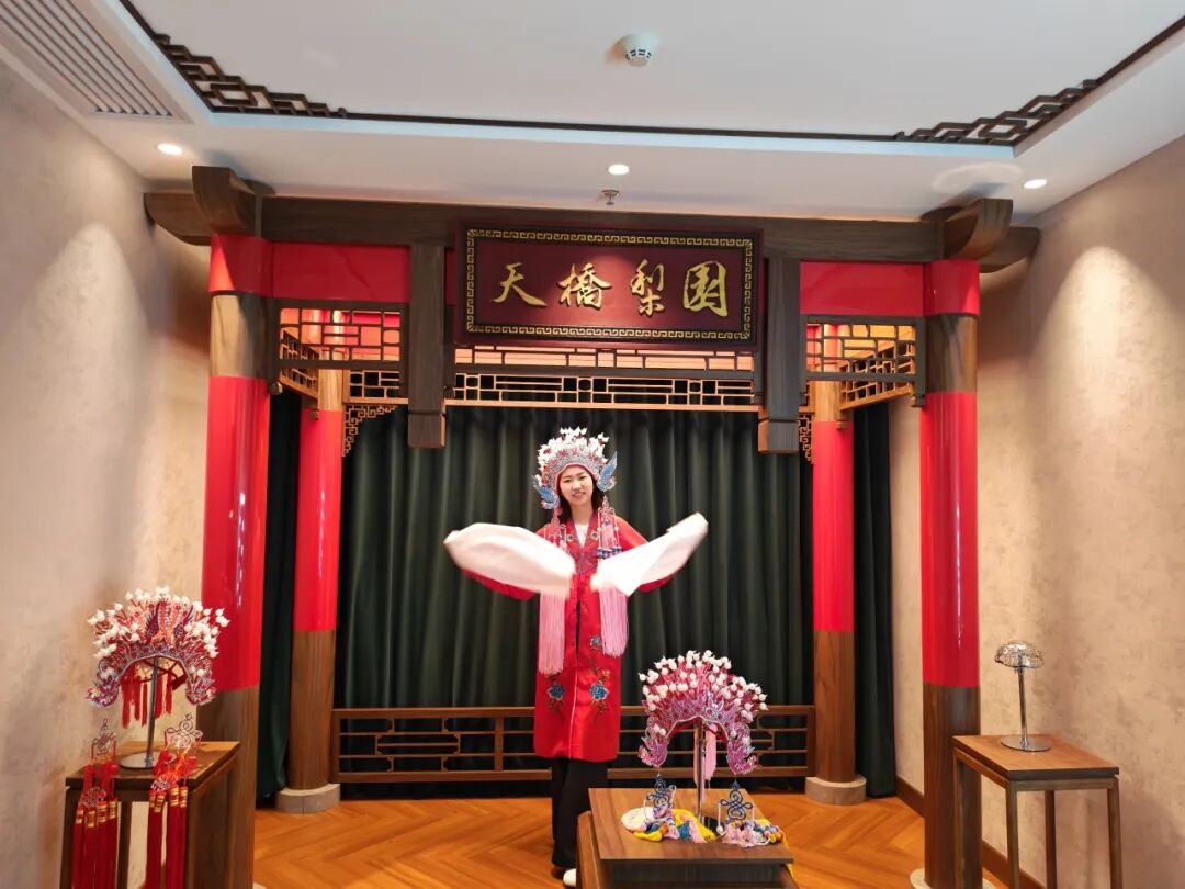 真正的文化传承,不止于观赏,更在于参与。酒店还专设非遗手作体验区,住客可亲手制作京剧脸谱、捏泥人、编快板,儿童还可尝试还原天桥戏法中的小道具。梨园互动体验区提供服饰换装服务,游客穿上行头,学几句唱腔,在镜前定格属于自己的“名角时刻”。