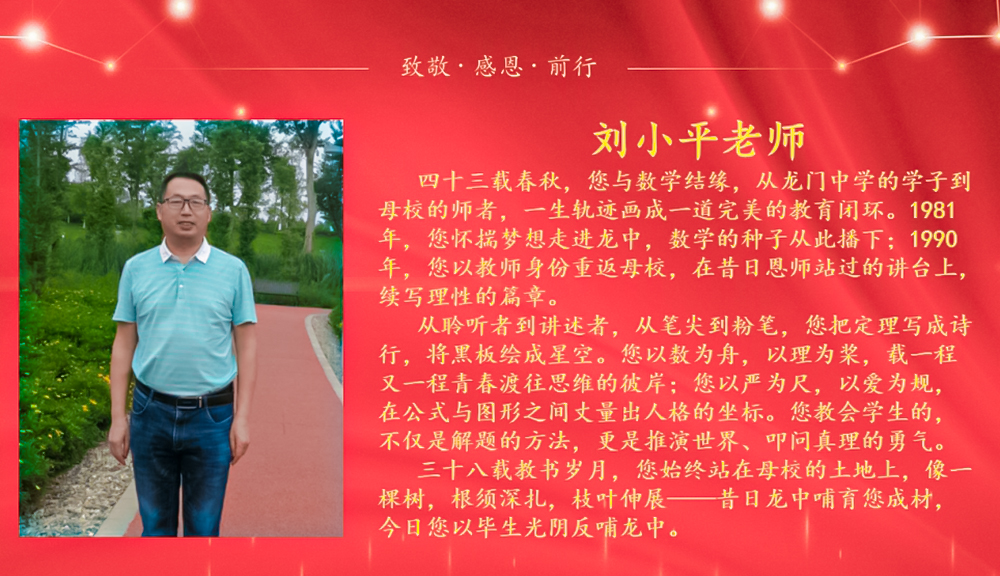 从龙中学子到母校师者,刘老师用四十三载春秋画成完美的教育闭环。1981年怀揣梦想入校,1990年重返讲台,三十八载教书岁月里,他将数学定理写成诗行,把黑板绘成星空,以数为舟、以理为桨,载着一届又一届青春驶向思维彼岸,更教会学生推演世界、叩问真理的勇气。