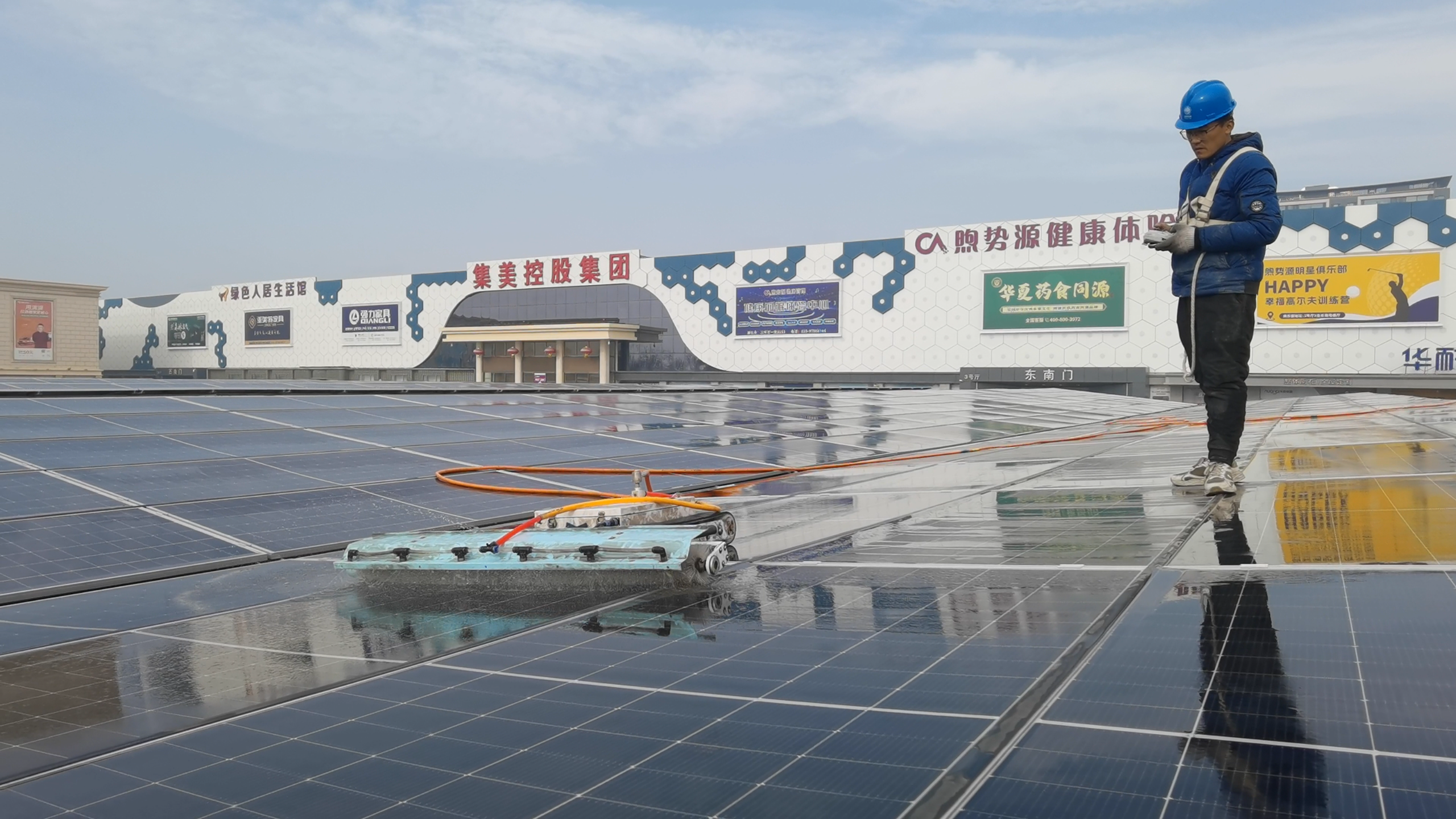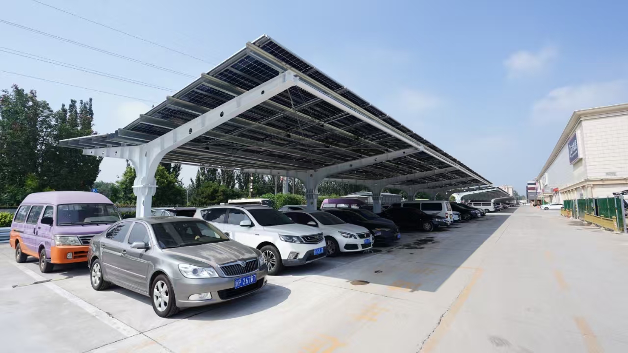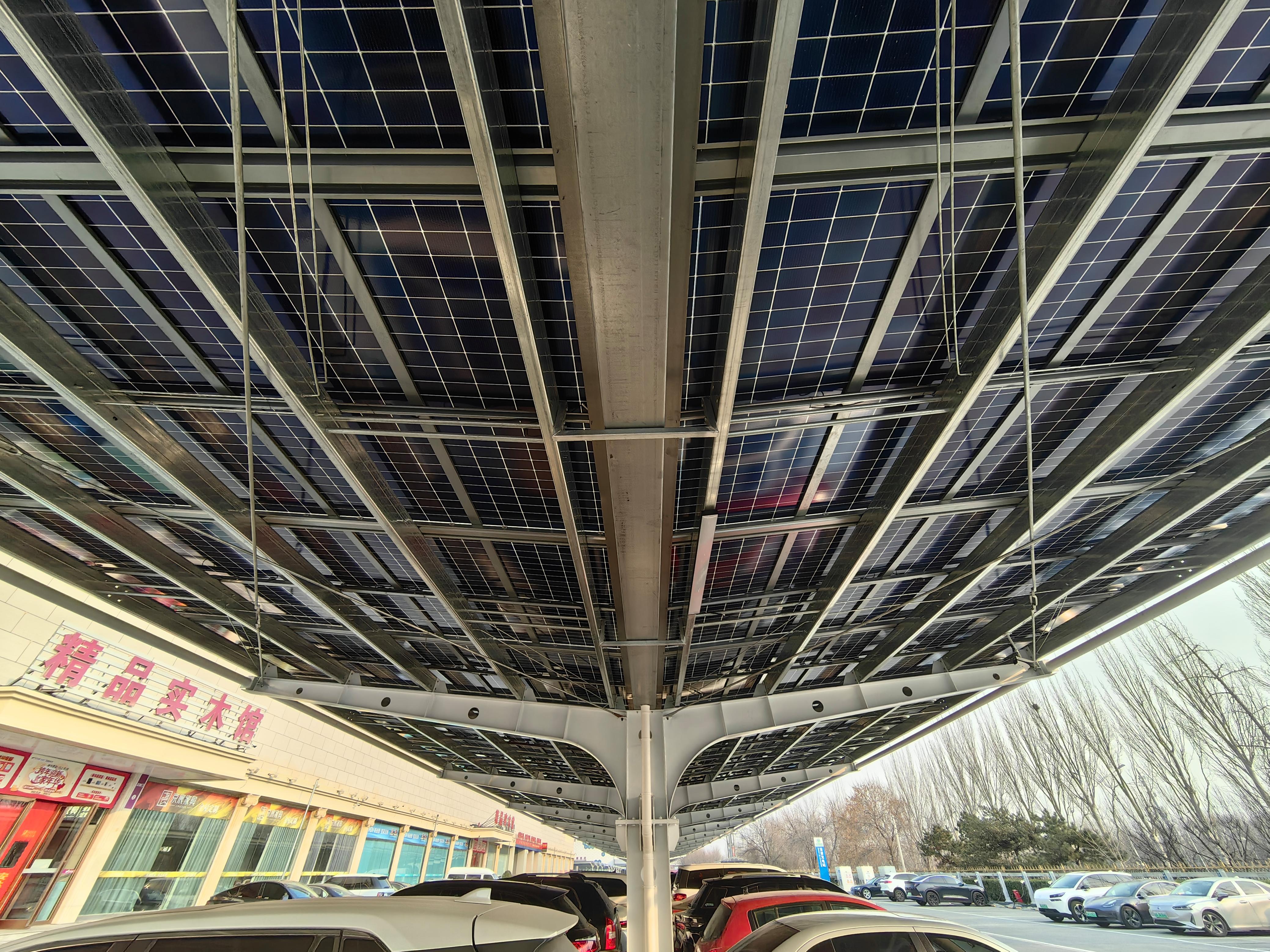 记者了解到,2兆瓦项目位于大红门集美家居广场露天停车位,采用装备式V字型光伏车棚造型设计,以简洁流畅的线条打造出兼具稳固性、科技感与美学价值的空间载体。3000多块高效单晶双面光伏组件整齐排布,形成一片规整有序的“能源天幕”,既为千余个车位提供遮阳避雨的贴心保障,又依托光伏组件实现绿色电能高效转化。