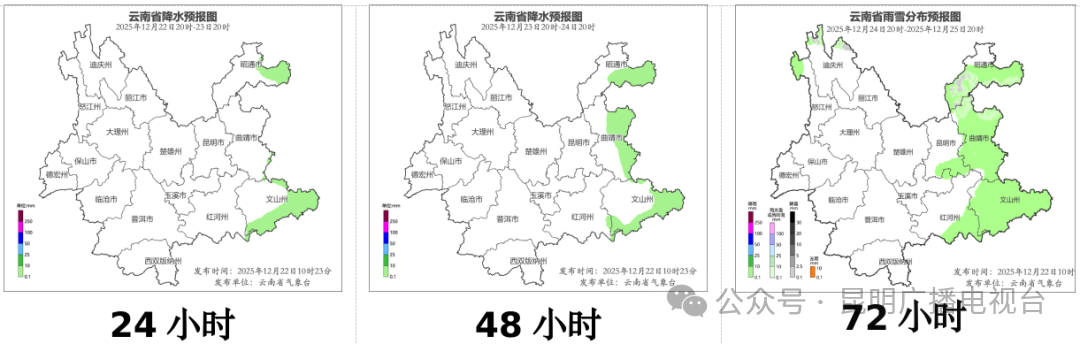 12月23日20时到12月24日20时:昭通市东部、曲靖市东部、文山州东部和南部、红河州东南部阴天间多云有阵雨,其他地区晴间多云。
