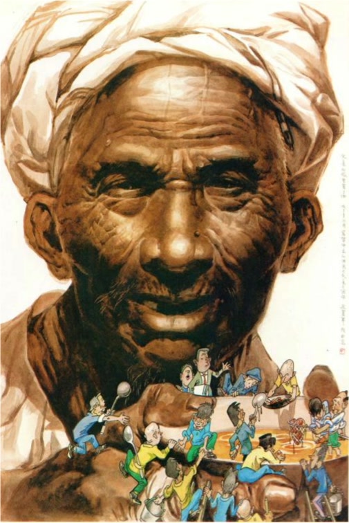 众所周知,漫画是夸张的艺术,具有作者主观判断的作品才能称之为“漫画”。否则只能称之为“插图”或者“插画”,与“漫画”外形相似,却缺少“灵魂”。在画面表现上“漫画”作品中需要用漫画语言来表现作者的思想。对于初学者而言,漫画语言非常抽象,似乎看不见也摸不着,无从下手,然而,看漫画时间长了,也就慢慢了解了漫画语言的存在。学习漫画语言的方法还是有很多种的,其中有一种称为“名作改编法”,最典型的作品便是王复羊的《父亲碗里有了肉》和詹同的《摆平》。