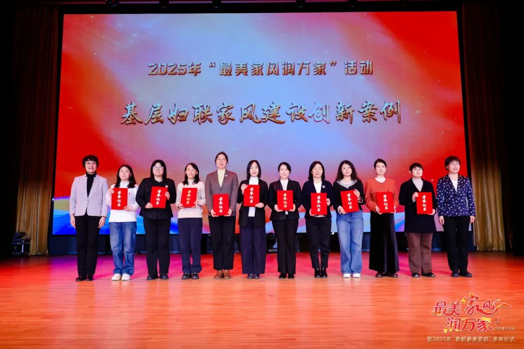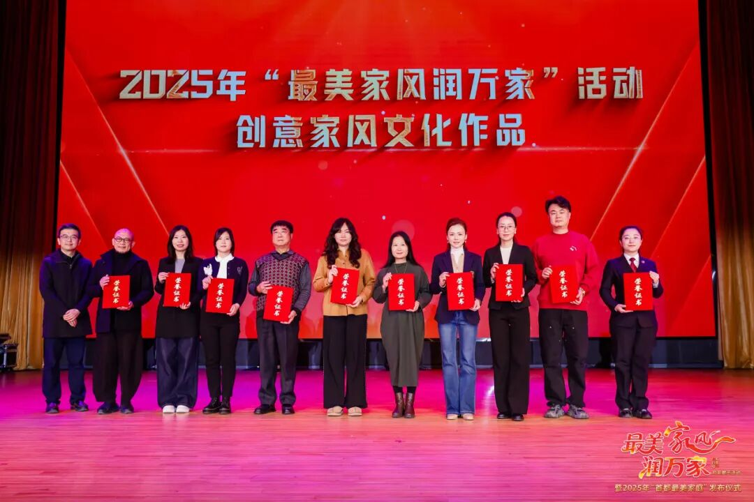本次活动以“家规家训亮家风、家书家信传家风、科学家教育家风、移风易俗树家风、家庭助廉正家风、千馆万员讲家风”六大家风主题为核心,通过情景剧演绎、家风故事分享、创意作品展演等丰富形式,集中展现首都家庭向上向善的精神风貌。活动现场发布了2025年度“首都最美家庭”名单(100名)及最美家风家庭优秀作品(10个)、基层妇联家风建设创新案例(10个)、创意家风文化作品(10个)名单,一批彰显时代精神的家庭典范与实践案例脱颖而出,为全市家风建设树立了鲜活标杆。