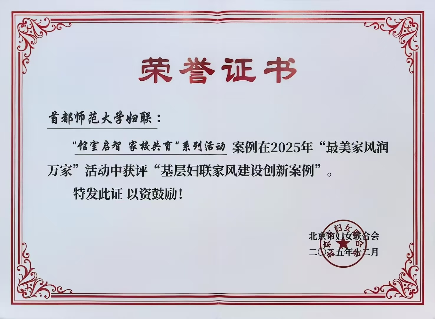 展望新一年,我校妇联将以此次荣誉为契机,进一步发挥创新案例与优秀家庭的示范引领作用,持续深化家风建设与家校共育融合实践,挖掘更多高校家庭的家风故事,推动优良家风浸润校园、惠及万家,为首都家庭文明建设与高校立德树人工作注入更强劲的巾帼力量。
