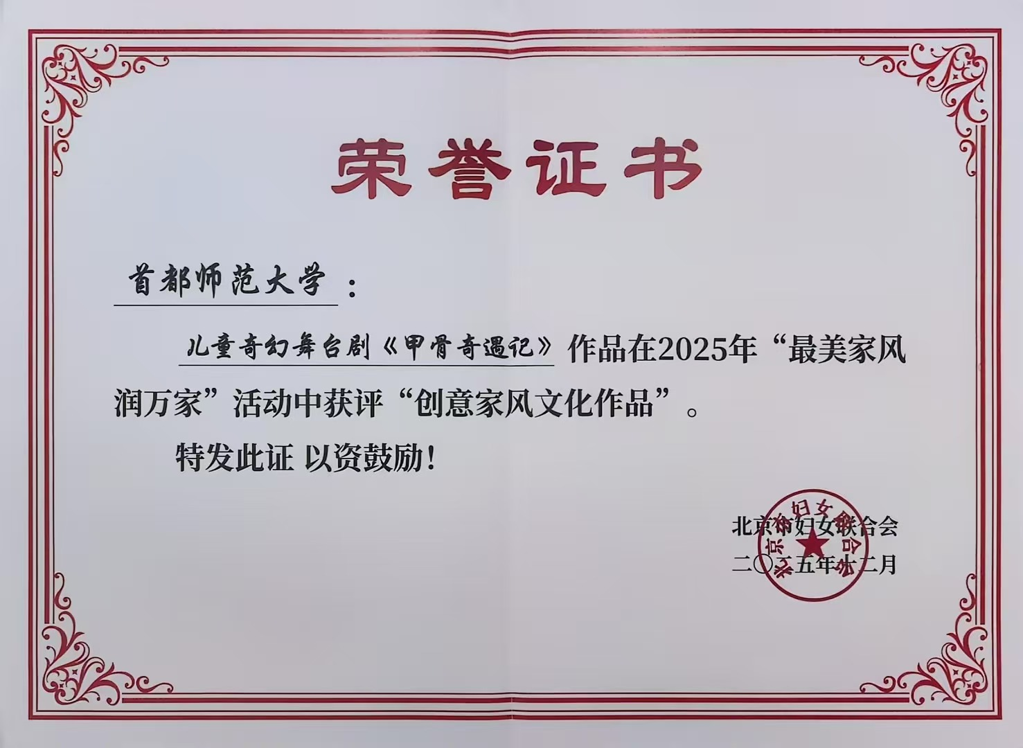 我校“馆室启智 家校共育”系列活动案例获评“基层妇联家风建设创新案例”,该案例依托校内丰富的博物馆、实验室资源和学科人才优势,联合十家二级单位党组织,举办“快乐家庭,亲子行动”、“走进奇妙的科学世界”系列活动,本校近300多户家庭、700多人次积极参与活动,创新家校协同育人模式,将家风教育融入实践体验;与文学院创意产业与传媒文化研究中心、甲骨文研究中心、中国女性文化研究中心共同孵化的儿童奇幻舞台剧《甲骨奇遇记》获评“创意家风文化作品”,作品以传统文化为载体,用童真视角演绎家风传承故事,兼具思想性与艺术性;文学院姚志红家庭荣获“2025年首都最美家庭”,该家庭以三代航天人的家风实践,生动诠释了新时代家庭的责任与担当。