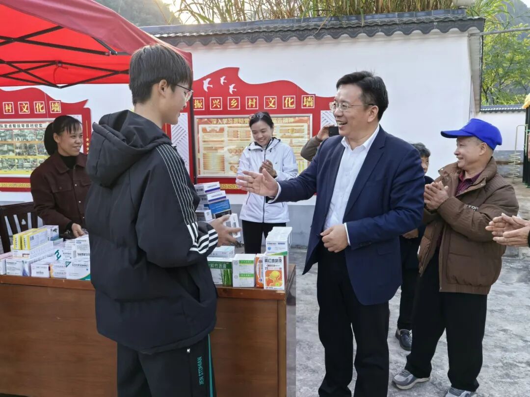 15日下午,刘波一行前往龙湾乡琴棋村实地调研,现场察看秀珍菇方舱种植、风干加工以及岩黄连等中草药种植情况,详细了解产业发展模式和带农增收成效。随后,调研组深入脱贫户家中走访慰问。在琴棋村村部召开的调研座谈会上,刘波表示,琴棋村在乡村面貌上取得的积极成效让人深受鼓舞,并特别感谢都安县各级干部对学校挂职干部的关心支持与帮助。学校将继续整合优势资源,紧密结合地方发展需求,推动产业转化为现实生产力和提升百姓的幸福指数,支持琴棋村巩固拓展脱贫攻坚成果,携手扎实推进乡村振兴。调研期间,学校校医院医务人员为村民开展义诊并赠送药品,刘波、谭凯向村民代表发放药品,传递关爱之心。