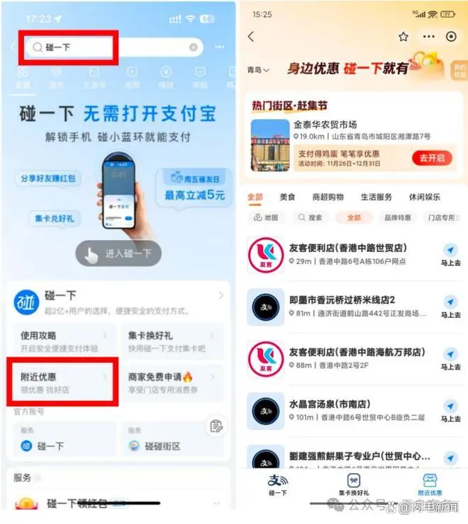 消费者可登录支付宝搜索“碰一下”,查看附近参与活动门店信息,享受优惠便利服务。