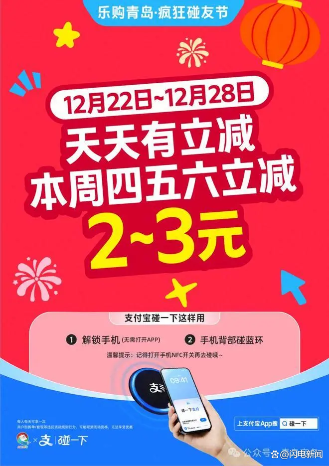 为深入贯彻落实国家、省、市关于促进消费的决策部署,进一步激发市场活力,释放消费潜力,市商务局组织支付宝于2025年12月24日至28日,在全市范围内开展“乐购青岛·疯狂碰友节”暖冬消费季促消费活动。