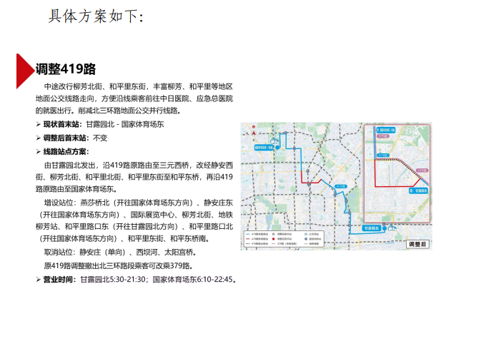 为优化公共交通走廊资源配置,整合地面公交运力资源,市交通委组织公交集团针对三环路、圆明园西路、南中轴、石门路等走廊拟定了调整419路、608路等9条公交线路方案。同时,将采取增开区间快车、相关线路适时增加运力等措施,保障既有乘客公交出行。现对此次公交线路优化方案网上公开征求意见,欢迎社会各界提出意见建议。
