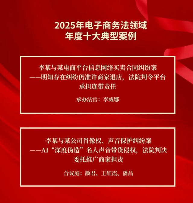 年会还发布了《2025年电子商务法领域年度十大典型案例报告》,北京互联网法院审理的“明知存在纠纷仍准许商家退店,法院判令平台承担连带责任”“AI‘深度伪造’名人声音带货侵权,法院判决委托推广商家担责”两案入选。