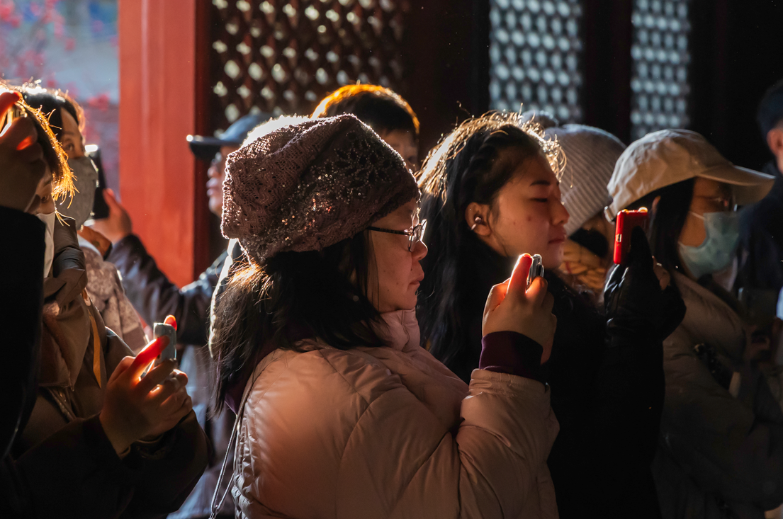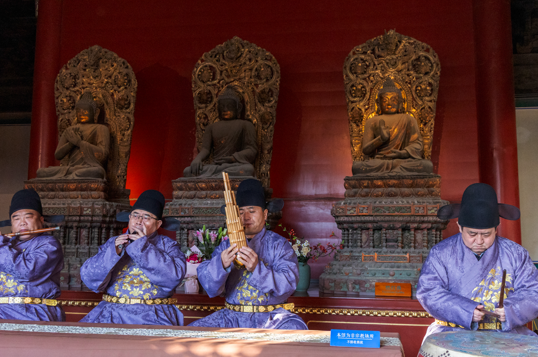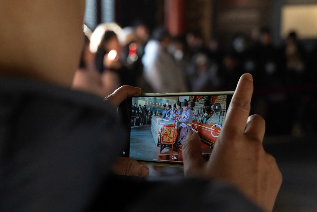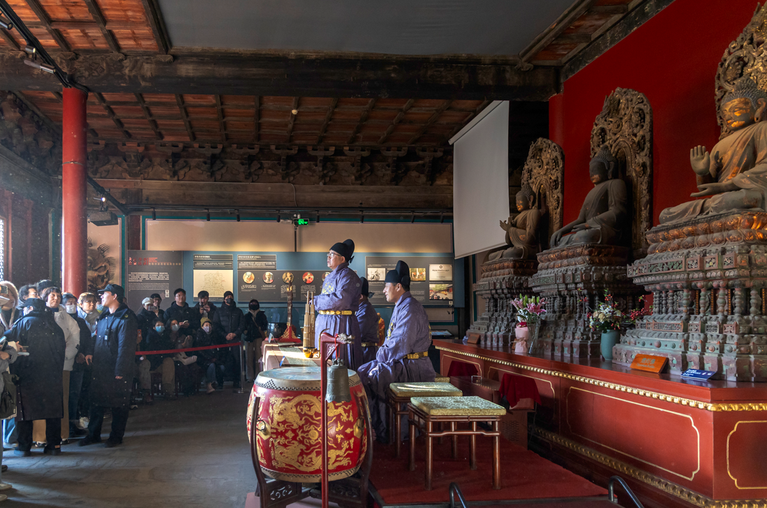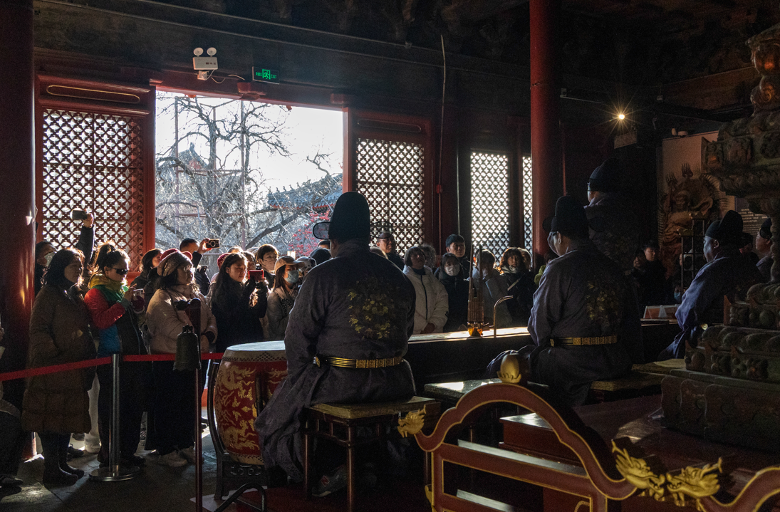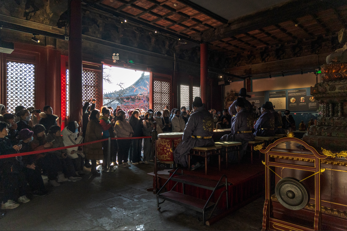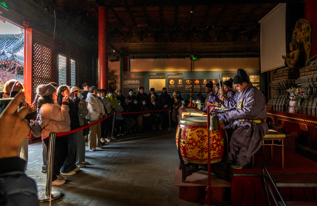 智化寺京音乐是北京市国家级非物质文化遗产之一。京音乐每日准时奏响,上午十点、下午三点各有一场演出,引得无数人为之奔赴。现场,人们纷纷举起手机录音录像,生怕错过这难得的古韵。一曲悠扬婉转的京乐响起,恍惚间,便将人带回了数百年前的大明王朝。