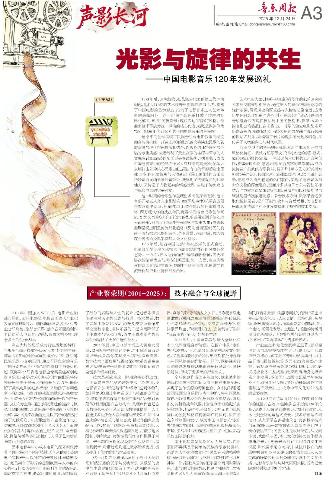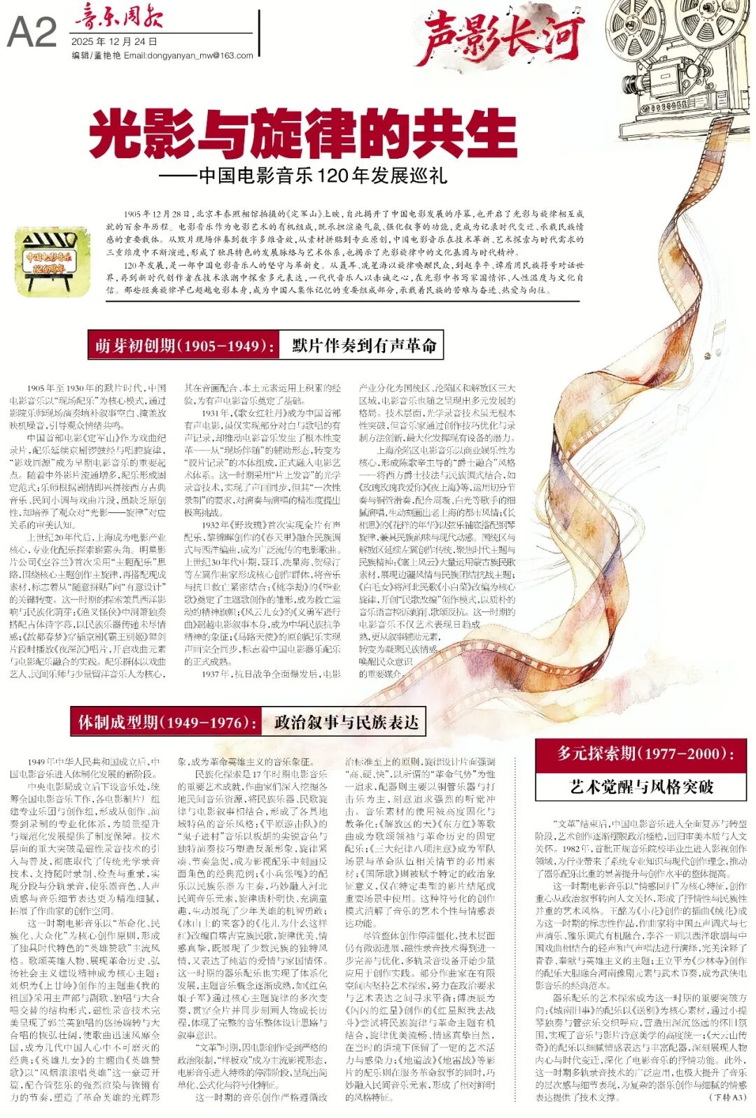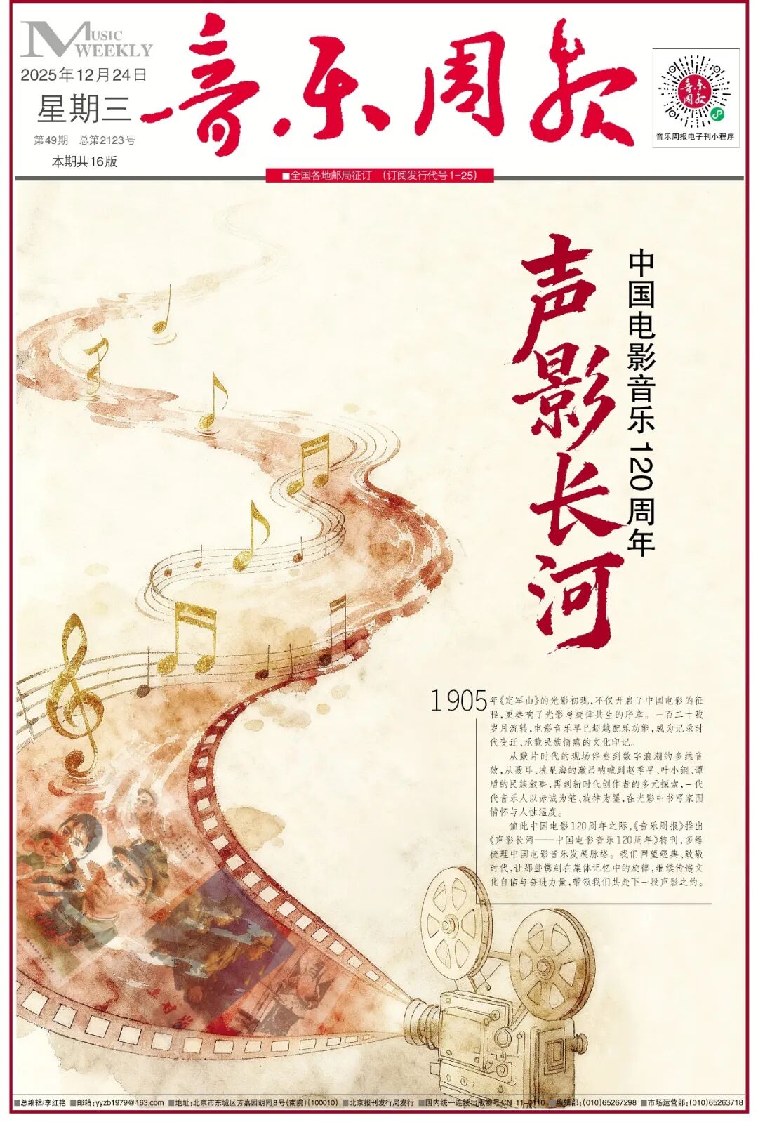 值此中国电影120周年之际,《音乐周报》推出《声影长河——中国电影音乐120周年》特刊,多维梳理中国电影音乐发展脉络:通过深度访谈老中青三代代表性电影作曲家,独家揭秘聂耳、雷振邦等先辈的激昂创作,解读赵季平、叶小钢、谭盾等当代大家的民族叙事内核,探寻新时代创作者多元探索背后的灵感与匠心;同时聚焦中国广播电影交响乐团、长影乐团等国家级团体的历史传承,挖掘其参与经典配乐录制的珍贵历程。