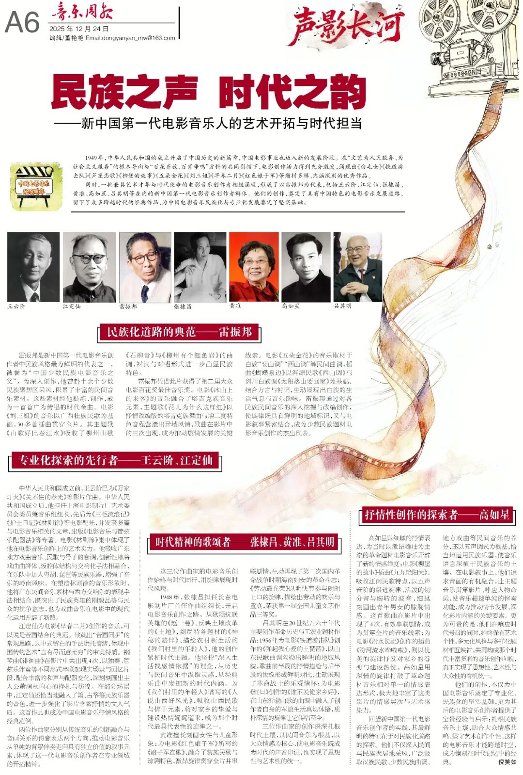 同时,一批兼具艺术才华与时代使命的电影音乐创作者相继涌现,形成了以雷振邦为代表,包括王云阶、江定仙、张棣昌、黄准、高如星、吕其明等在内的新中国第一代电影音乐创作者群体。他们的创作,奠定了具有中国特色的电影音乐发展道路,留下了众多跨越时代的经典作品,为中国电影音乐民族化与专业化发展奠定了坚实基础。