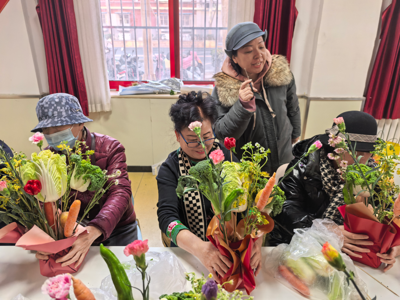 活动现场暖意融融,工作人员早早备齐娃娃菜、彩椒、胡萝卜等新鲜食材。活动伊始,老师为居民讲述元旦节日的由来与历史故事,随后为大家教授蔬菜花束的修剪、固定、搭配以及包装等制作技巧。