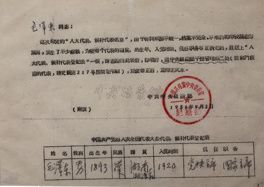 1956年9月2日毛泽东填写的《中国共产党第八次全国代表大会代表、候补代表登记表》,入党时间为1920年。