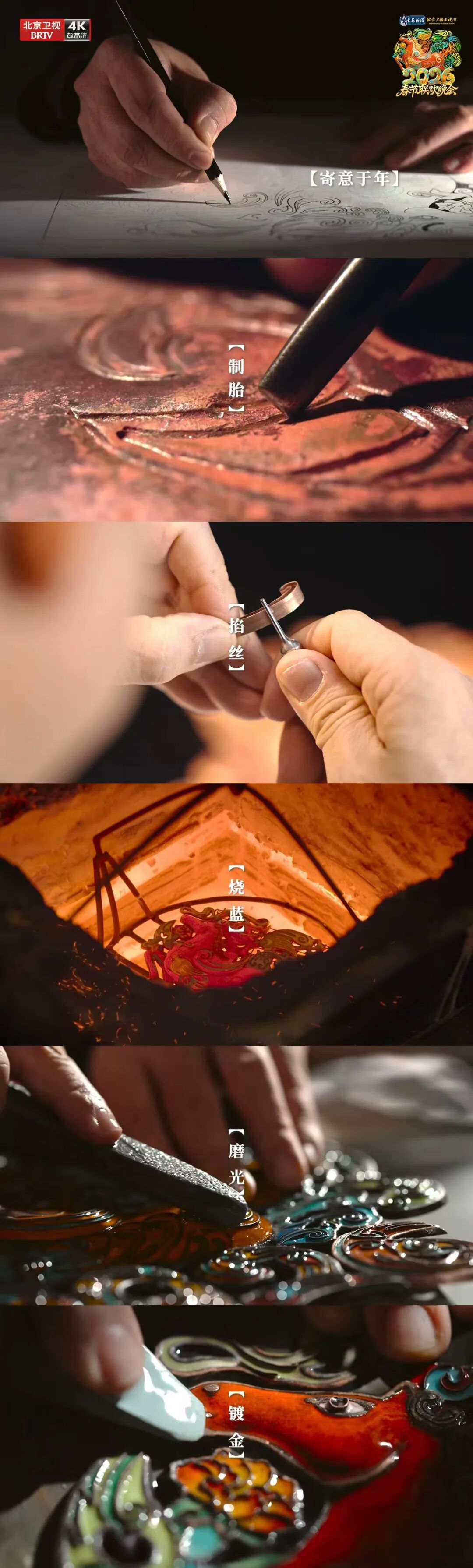 今年春晚的LOGO背后,承载的是一部“非遗工艺的微缩史诗”。它生动复现了“燕京八绝”之一——铜胎掐丝珐琅的完整精妙工序:从锻打铜胎为骨,到金丝掐作经脉;从釉彩点蓝为肌,到窑火反复淬炼其魂;最终经打磨鎏金,一匹骏马终于在时光与匠心的交融中,披覆流光,跃然而出。