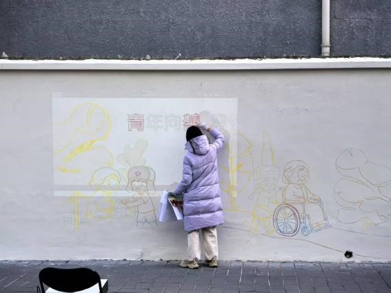 在墙绘过程中,与队友的团结协作,加深了我对团队精神的理解。当放学的小朋友兴高采烈的加入当我们的团队,一声声亲昵的“小老师”使我切实感受到了为社会做力所能及的事所带来的力量。我们用画笔绘出鲜艳的色彩,让原本黯淡无光的院墙焕然一新,充满了生机与活力,社区民众的热情也在寒冬中带来了暖心和暖意。在大家共同的努力下,社区变得更加和谐美好。