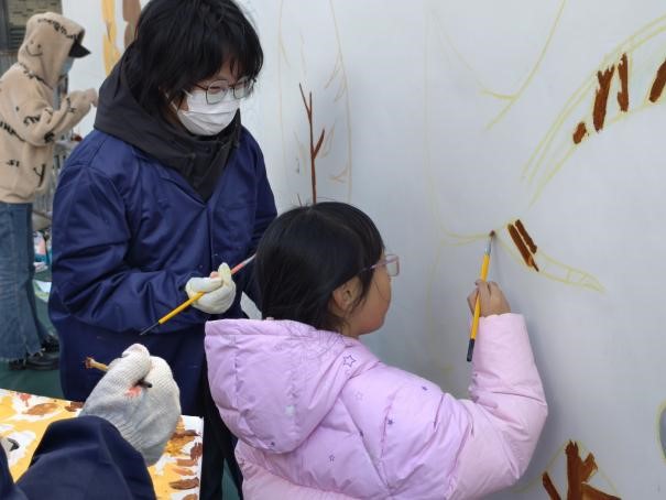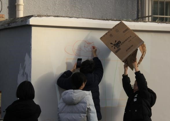 墙绘活动绘制阶段,师生团队克服初冬低温天气,坚持每日到岗,分工有序,展现出高度的责任感与协作精神。大家依据最终确定的设计方案,逐步完成墙面清理、线稿勾勒、色彩填充、细节修饰与涂刷保护层等工序。在整个过程中,大家充分结合建筑与艺术专业所学,注重色彩搭配与画面协调,确保墙绘作品在视觉上与社区环境和谐相融。