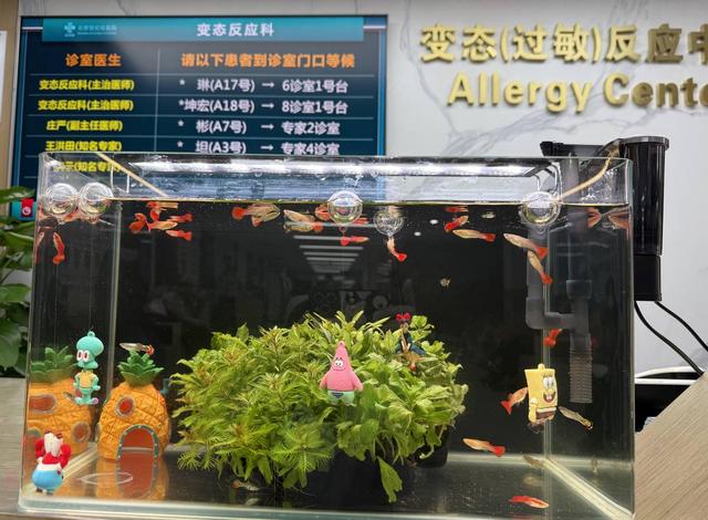 近日,在北京世纪坛医院变态反应科候诊区,多了一处超人气的“童话角落”——一方透亮的鱼缸里,五彩斑斓的小鱼自在穿梭游弋,水草随波轻轻摇曳。而最让孩子们欢呼雀跃的,是藏在缸中的“秘密惊喜”:海绵宝宝和派大星守着它们的菠萝屋,章鱼哥的小房子旁还站着灵动的小仙女摆件,仿佛把动画片里的比奇堡和梦幻仙境一起搬到了诊室。