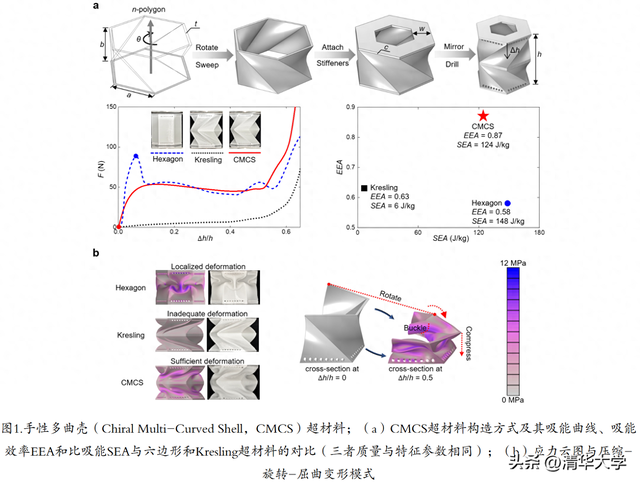为此,清华大学航天航空学院柳占立课题组与合作者提出了一种手性多曲壳(Chiral Multi-Curved Shell,CMCS)超材料,通过压扭与屈曲机理的协同耦合,实现了“高承载力-平滑吸能曲线”的统一,并在此基础上兼具较高的吸能效率和比吸能(图1a)。通过独特的压缩-旋转-屈曲变形模式,应力得以在结构的大部分区域内分布,充分发挥了材料性能,同时有利于避免因应力过度集中而导致的局部过载与失效(图1b)。