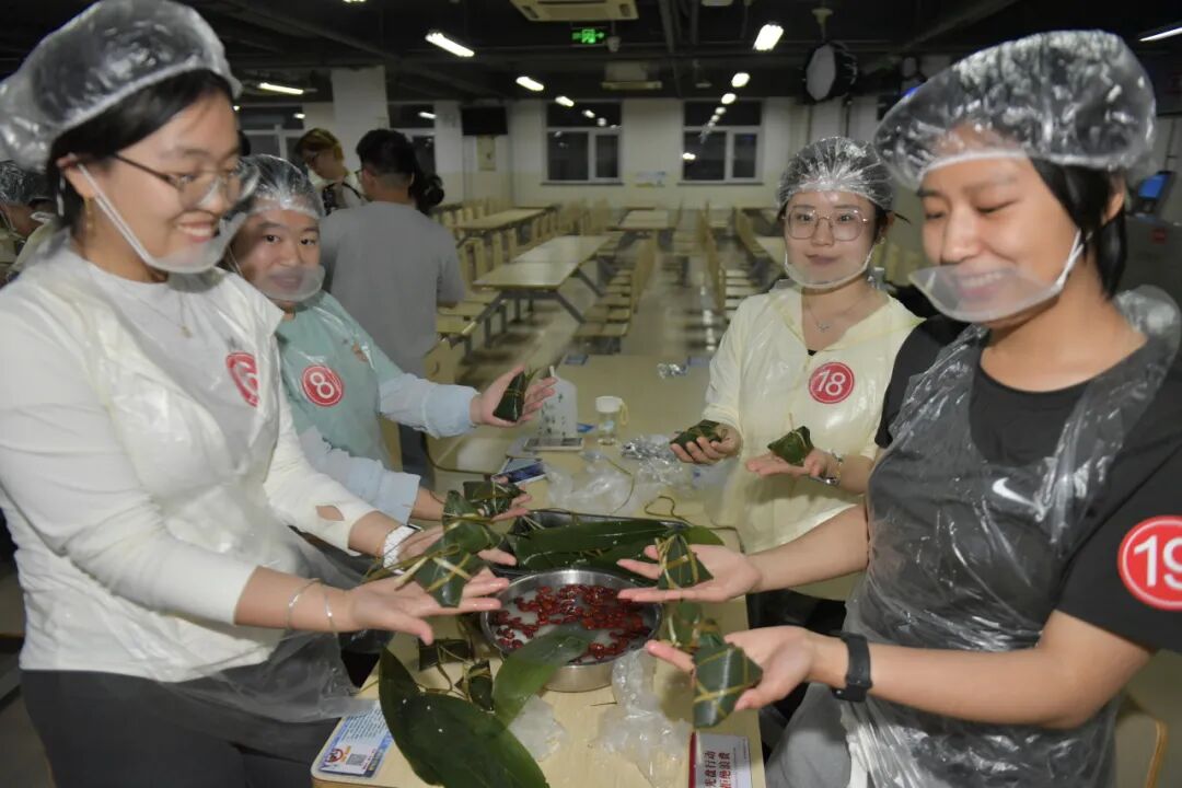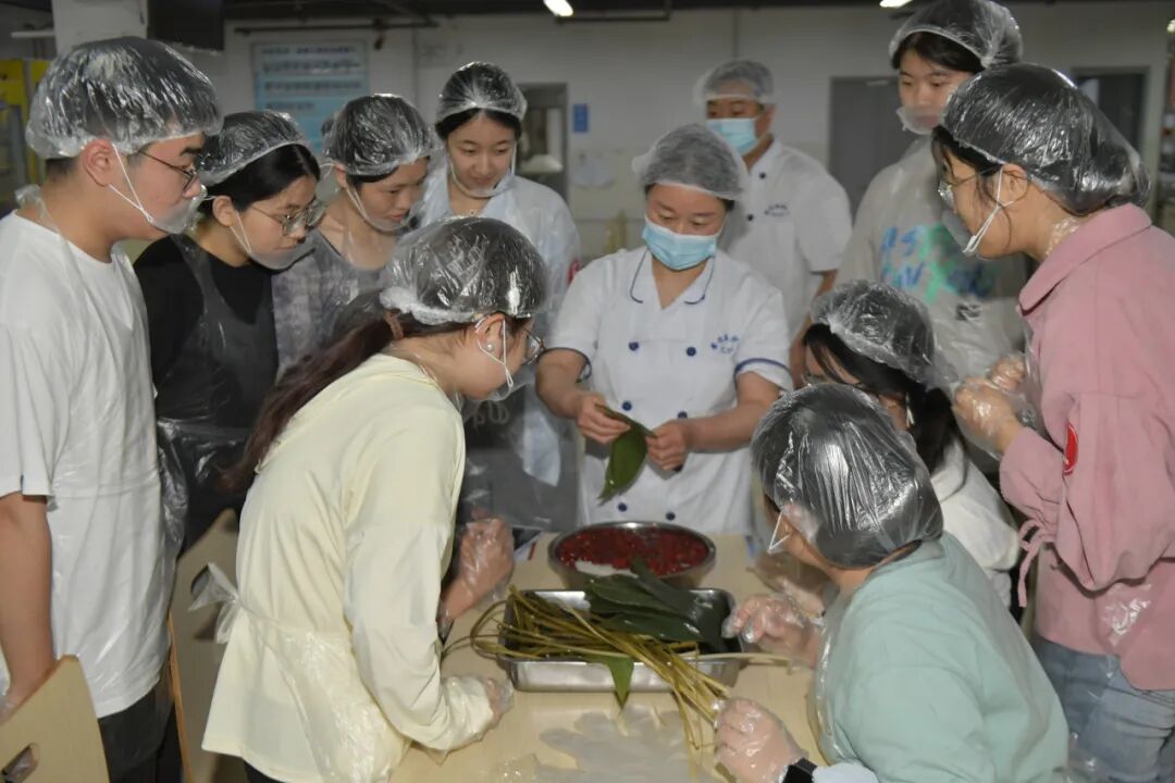 课程设计既贴合日常需求,又融入文化内涵。5月23日,恰逢端午前夕,第二期培训以“包粽子”为主题,将民俗文化与劳动实践巧妙结合。操作台上,翠绿粽叶、饱满糯米、香甜蜜枣整齐排布,厨师先示范折叶、填米、压实、捆扎的完整流程,再逐一纠正学子手法。大家围站桌前,有的小心翼翼调整粽叶弧度,有的互相帮忙理顺棉线,虽包出的粽子形态各异,但每一个都饱含专注与热情,粽香袅袅间,传统习俗在实践中得以传承。