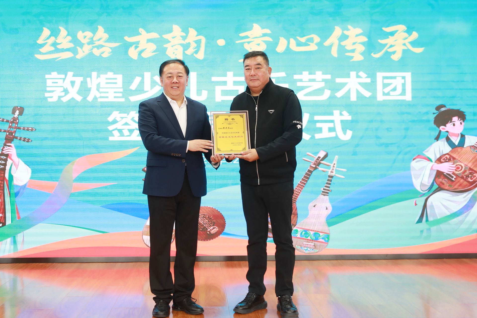 艺术团聘请了传统乐器制作技艺非遗传承人曹卫东、敦煌舞专家史敏教授、敦煌文化学者汪雪博士等担任特聘专家,现场还举行了专家聘书颁发仪式及乐器捐赠环节。曹卫东作为专家代表发言,表示将积极推动敦煌古乐在青少年中的活态传承与创新转化。