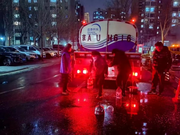 下午6点,首辆供水车到位,“应急供水”字样醒目。居民有序排队,携带各种容器取水。工作人员现场维持秩序,并提供小推车等工具协助搬运,同时,物业积极清理地面积水,防止结冰,大家各司其职,忙碌中更显温情。