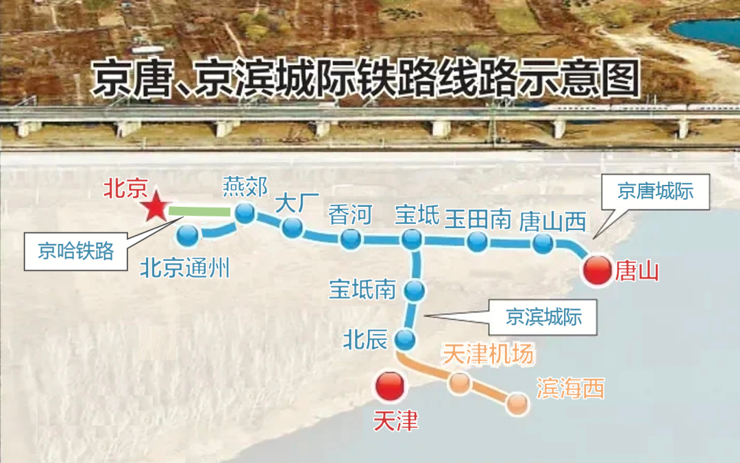 京唐城际铁路是《京津冀地区城际铁路网规划》的骨干线路,更是推进京津冀交通一体化的标志性工程。线路全长149公里,经北京市通州区、河北省廊坊市、天津市宝坻区,进入河北省唐山市,设北京通州站、燕郊站(改建)、大厂站、香河站、宝坻站、玉田南站、唐山西站、唐山站(既有)等8座车站,设计最高时速350公里。